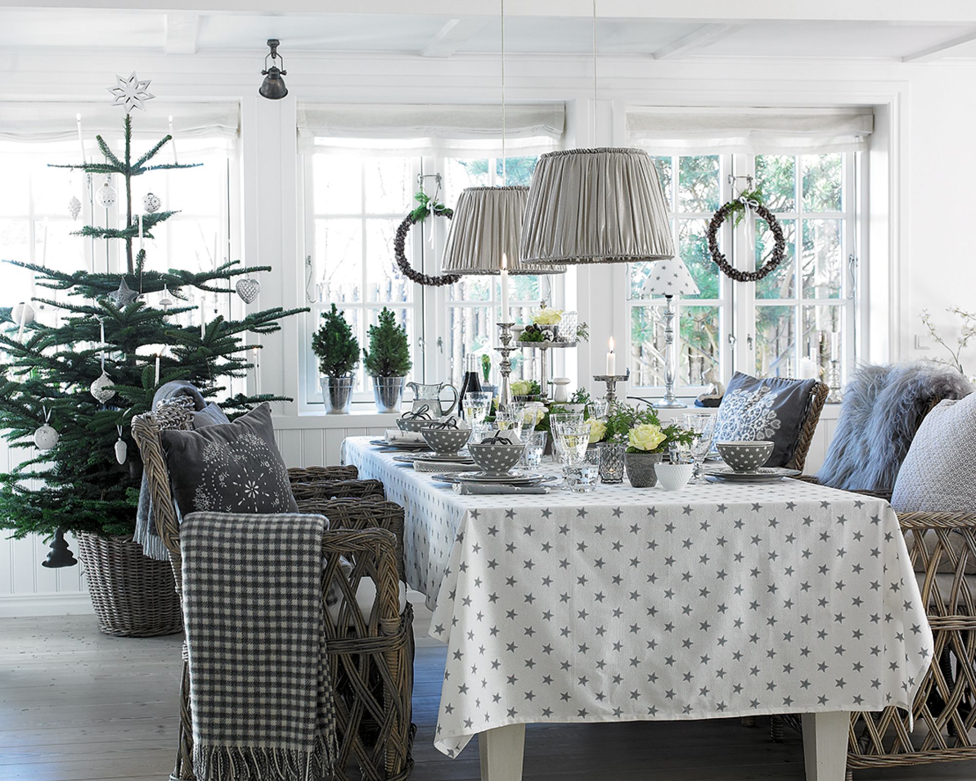 A gdyby tak nadchodzące święta zrobić na szaro? Spójrzcie tylko, jak pięknie wygląda aranżacja stołu i dekoracje domu, które proponuje WonderHome. Biały obrus, szara zastawa w białe gwiazdki, kilka delikatnych stroików z kremowych róż i kilku zielonych gałązek choinki. Do tego wiklinowe fotele otulone mięsistymi poduchami i futrzanymi pledami. Jest odświętnie, spokojnie, niezobowiązująco - jeśli nie na wigilijną kolację, to może na świąteczne śniadanie? &nb