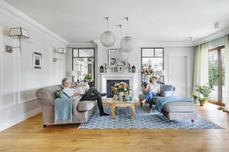 Lekko, przytulnie i wygodnie – wnętrza w bieli, błękicie i szarościach z dębowymi podłogami