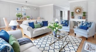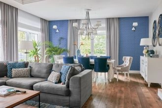 Mieszkanie w stylu hamptons – niebieskie akcenty i malarska tapeta w kwiaty robią wrażenie!