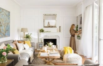 Kaszmirowe mieszkanie z bielą, akcentami beżu i tapetami w oprawie ze sztukaterii. To wnętrze koi zmysły!