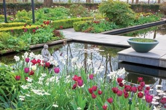 Wiosna nad stawem – holenderski ogród pełen tulipanów