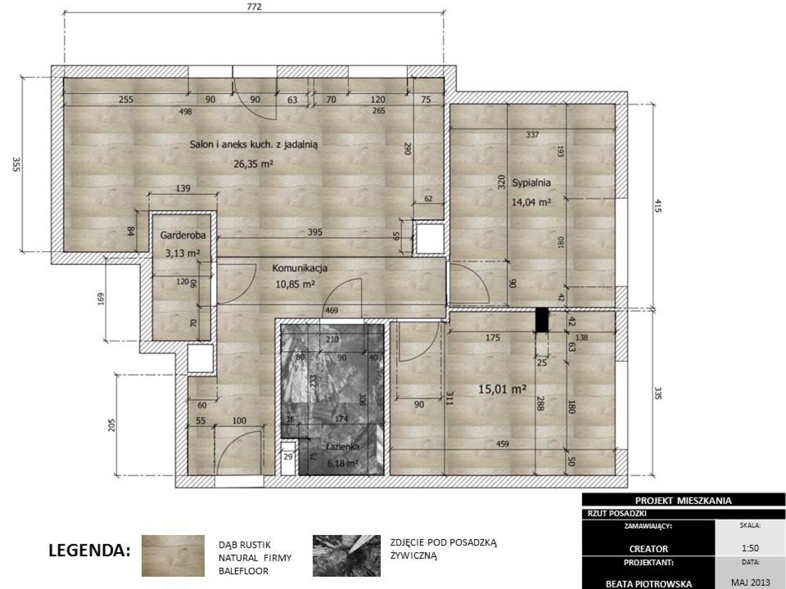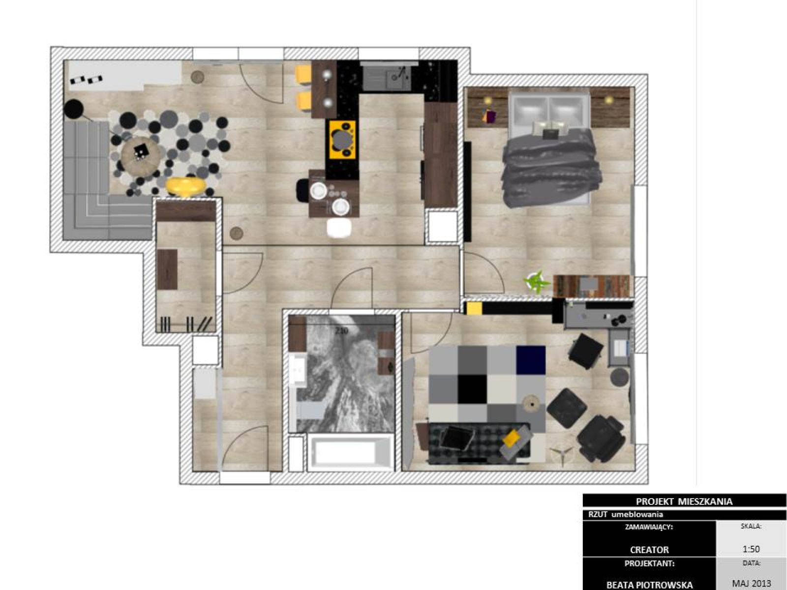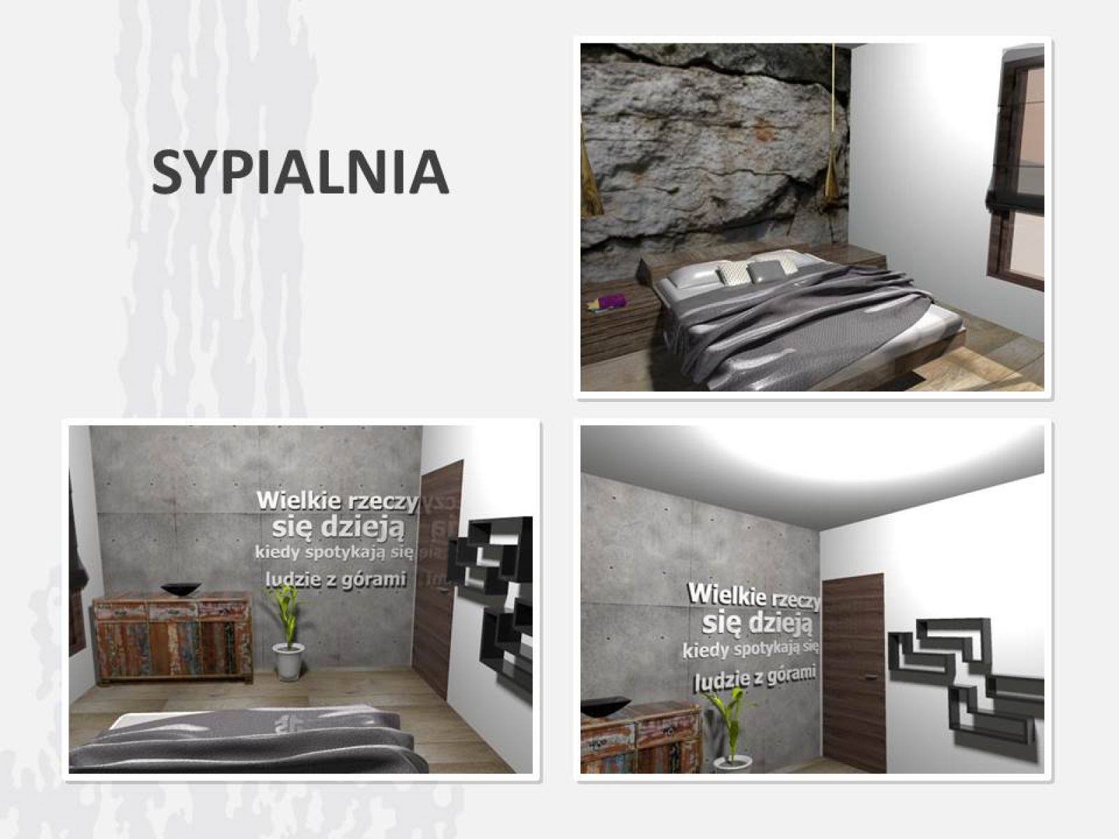 Autorka o projekcie: „Niejednokrotnie działamy pod wpływem impulsu. I tak właśnie powstał projekt, w ramach kursu, organizowanego przez firmę szkoleniową CREATOR. Kiedy okazało się, że znajoma weźmie udział w wyprawie wspinaczkowej na Kilimandżaro, wpadłam na pomysł projektu mieszkania dla himalaisty. Co mogę powiedzieć o wnętrzu? Męskie, minimalistyczne, z domieszką Tybetu i światowego designu. W aranżacji postawiłam na naturę, drewno i kamień. Moim ulubionym pomieszczeniem jest sypialnia, w której ścianę za łóżkiem zdobi tapeta z widokiem skał. Łóżko, z serii lewitujących, nawiązuje do ekstremalnych, himalajskich noclegów i jest ciekawym elementem dekoracyjnym, odwołującym się do pasji inwestora”.