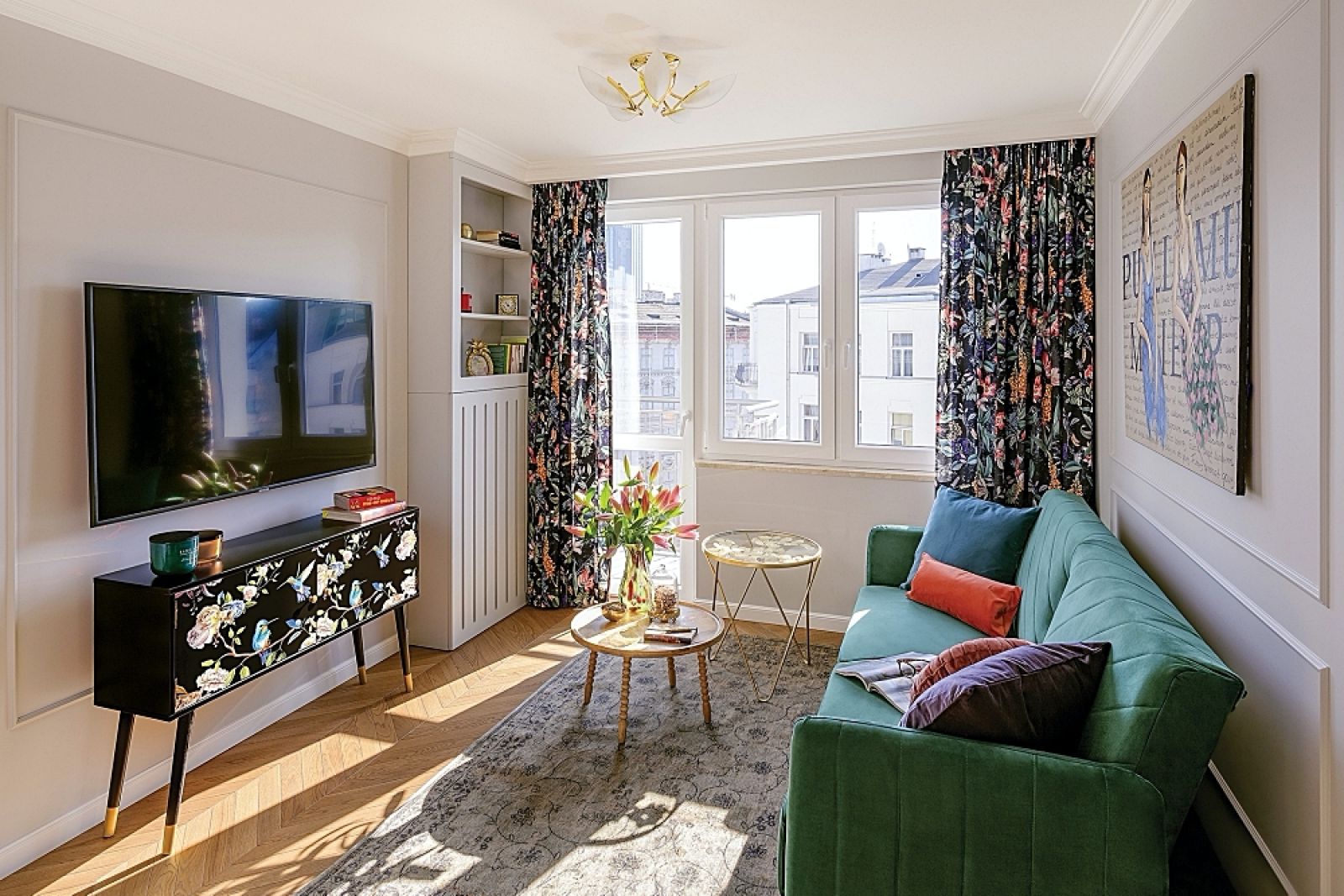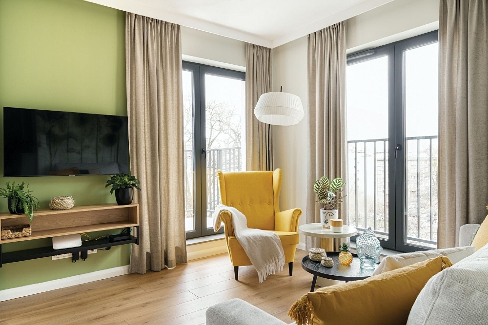 Barwne zasłony mogą być piękną dekoracją, która podkreśli kolor stolarki okiennej i ożywi stonowane wnętrze. W tym przypadku zielenie i brązy są też przedłużeniem tego, co dzieje się za oknem. Płynnie łączą strefę wewnątrz mieszkania z balkonem i dalej – widokami na zewnątrz.