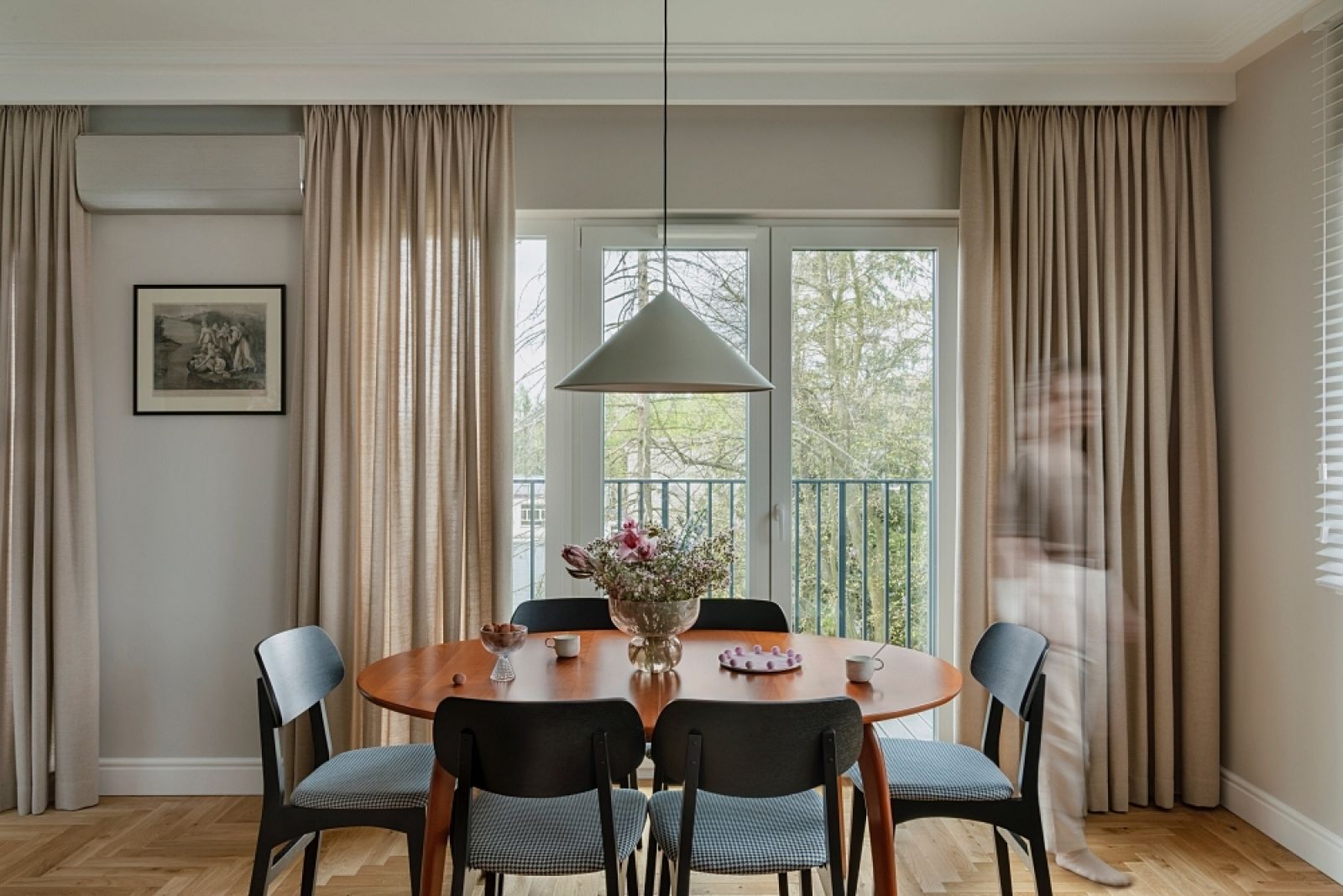 Dwa kolory zasłon w aranżacji okna tarasowego lub balkonowego sprawiają, że duże przeszklenia nie są tak dominujące w przestrzeni. Stają się bardziej przytulne, a salon mimo sporych rozmiarów jest kameralny.