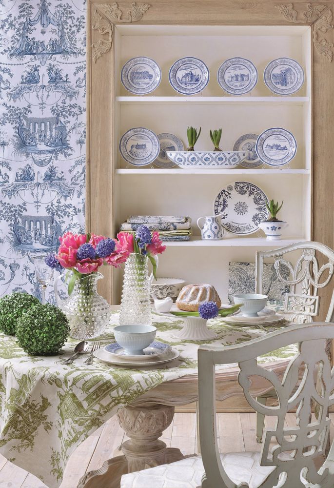 W tym wypadku na osłonki wykorzystano biało-kobaltowe naczynia. Wiosenną aranżację uzupełniają kwiaty hiacyntów i tulipanów wstawione do szklanych wazonów. Kule z bukszpanów nie są tu nawet konieczne. Sukcesem tej wielkanocnej dekoracji są ładnie dobrane kolory. Biało-kobaltowa tapeta i naczynia znakomicie grają z lnianym obrusem z domieszką zieleni. Do tych barw idealnie pasują fioletowe hiacynty i różowe tulipany oraz zieleń liści.