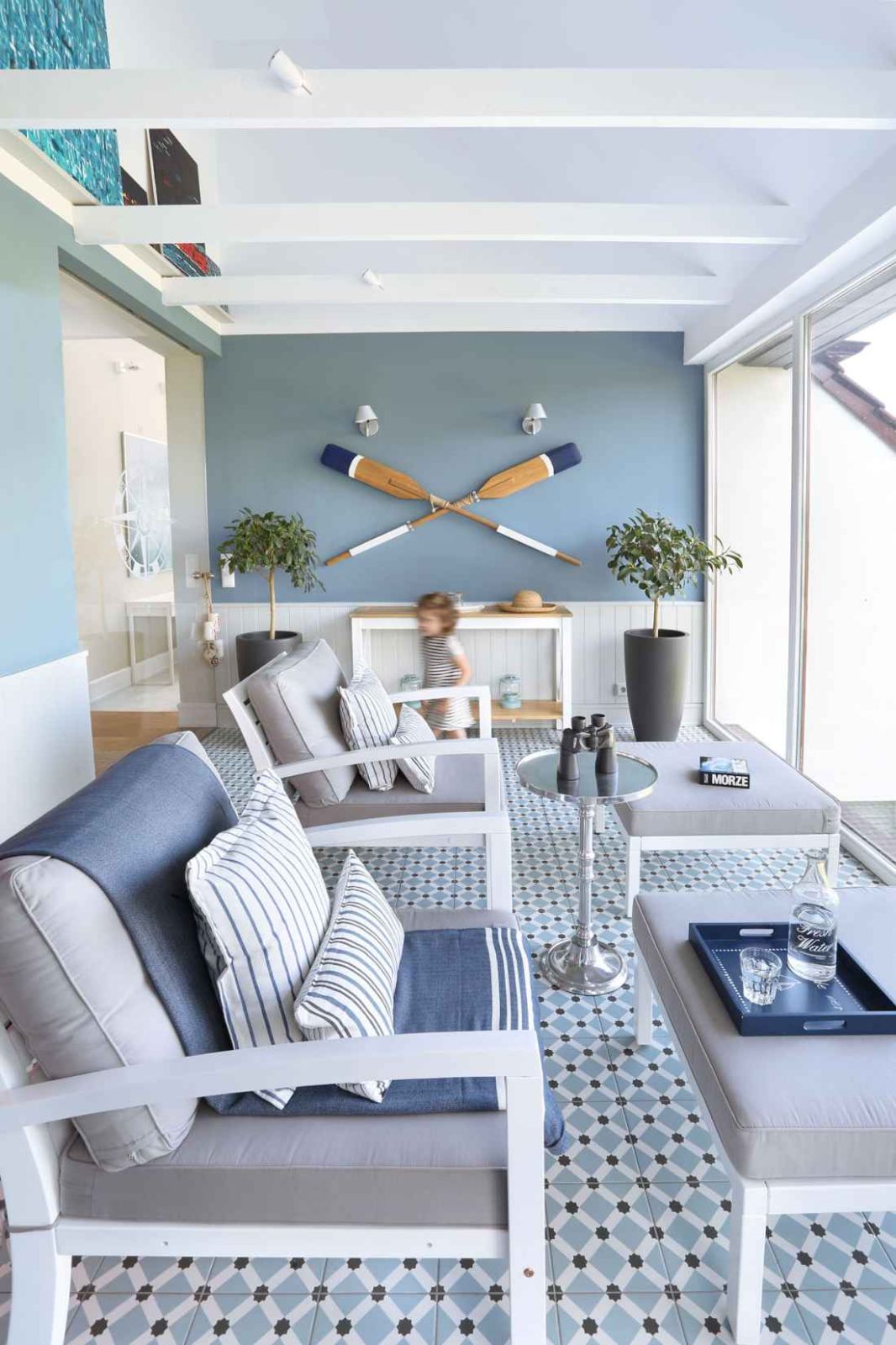Na ścianie kolorów jest kilka, ale salon wygląda spokojnie. To zasługa idealnie dobranych pastelowych tonów – od pudrowego różu przez gołębią szarość po błękit. Ciekawie pomalowano samą ścianę. Kolory użyto naprzmiennie, namalowane łuki przywodzą na myśl popualarny dziś modern classic. Farbami pomalowano też listwy przypodłogowe i framugi, dzięki czemu wnętrze wydaje się wyższe.