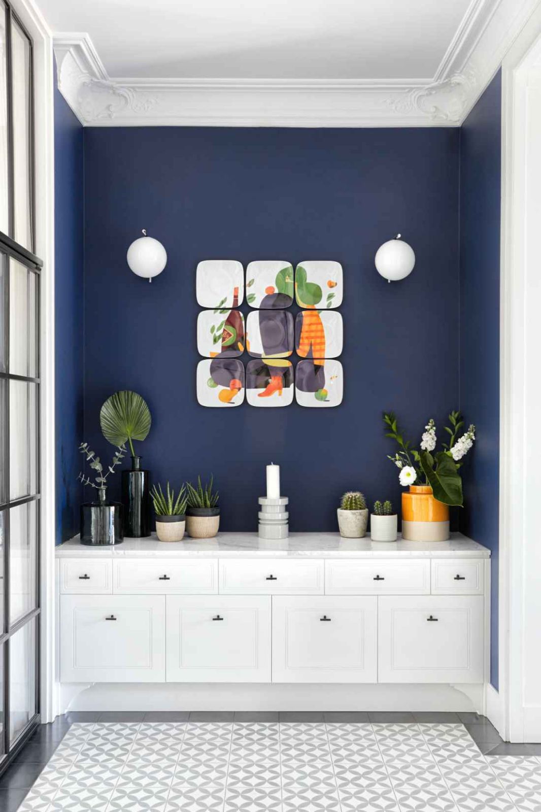 Tak pomalowana ściana przypomina obraz (ma nawet białe passe-partout) i sama dla obrazu jest idealnym tłem. Wszystko, co na niej ustawimy czy powiesimy, od razu będzie zwracać uwagę, więc kompozycja powinna być niebanalna. Na ciemnym tle pięknie będą wyglądały jasne, stylowe meble w salonie albo efektowne łóżko w sypialni.