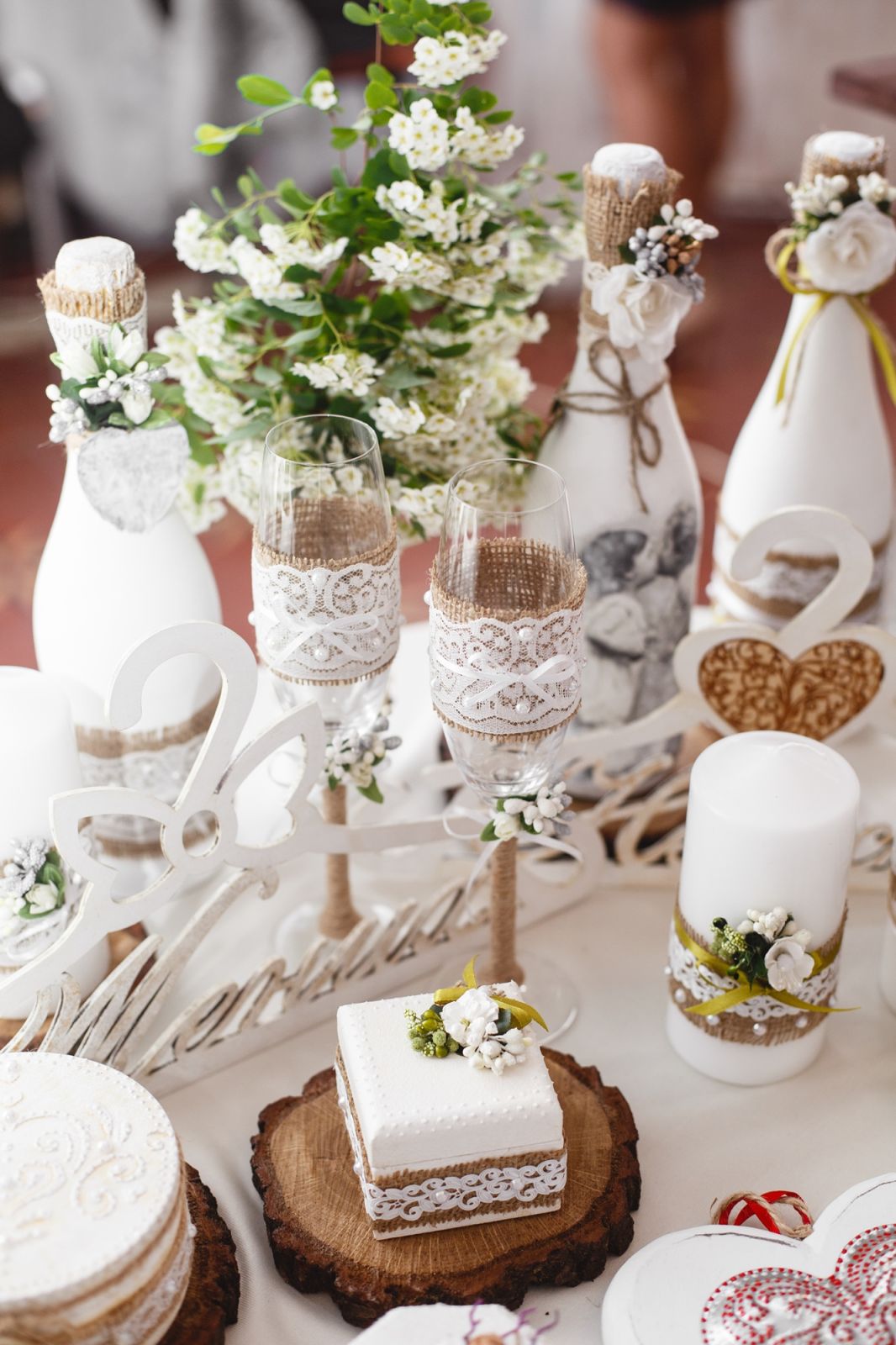 Dobrym pomysłem jest również umieszczenie kwiatów doniczkowych – koniecznie w białych osłonkach. Jeżeli takimi nie dysponujemy, doskonale w roli maskującej sprawdzi się krepina. Takie rośliny nie zostaną wyrzucone kilka dni po ceremonii i będą przynosić miłe wspomnienie przez długi czas.