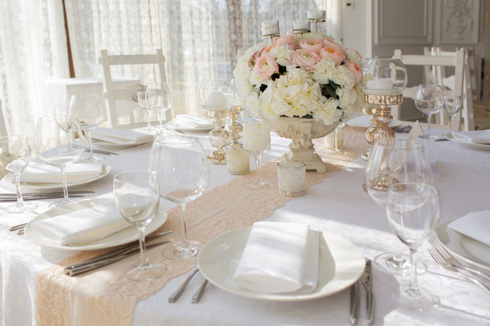 W wersji klasycznej na stole stawia się jedną główną dekorację i kilka mniejszych. Jednak dziś można odejść od tego schematu. Równie zgrabnie prezentują się małe wazoniki z pojedynczymi kwiatami, stojące w szeregu między talerzami.