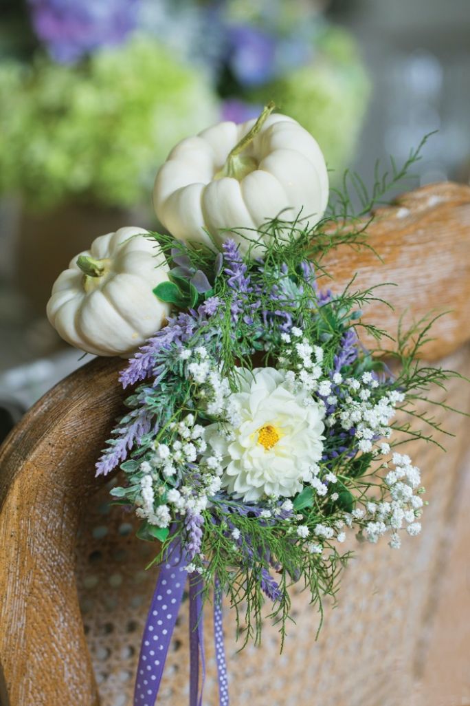 Ponacinaj mniejsze dynie i umieść w nich winietki z imionami gości. Własnoręcznie wykonanymi stroikami z białej dyni ozdabiaj nakrycia dla gości. Jeśli przygotowujesz dekoracje na przyjęcie lub rodzinną uroczystość zrób też minibukieciki. Takimi stroikami z dyni i kwiatów ozdabiaj krzesła przy stole.