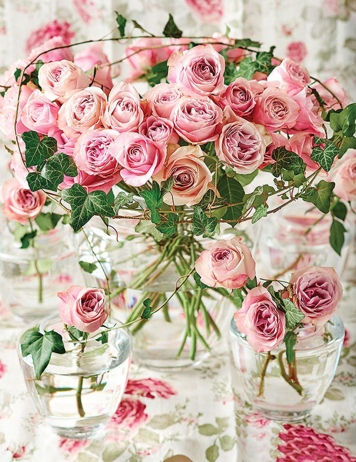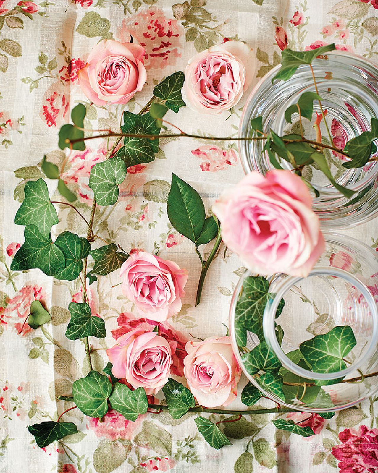 Duży pęk róż otulony gałązką bluszczu, do tego dwa mniejsze wazoniki z kilkoma główkami i już mamy na stole żywy obraz. Pomysł niczym z holenderskich mistrzów.