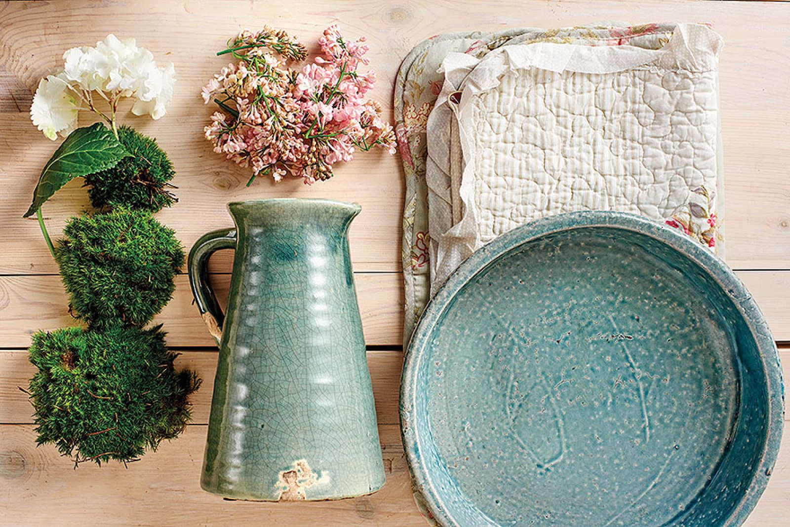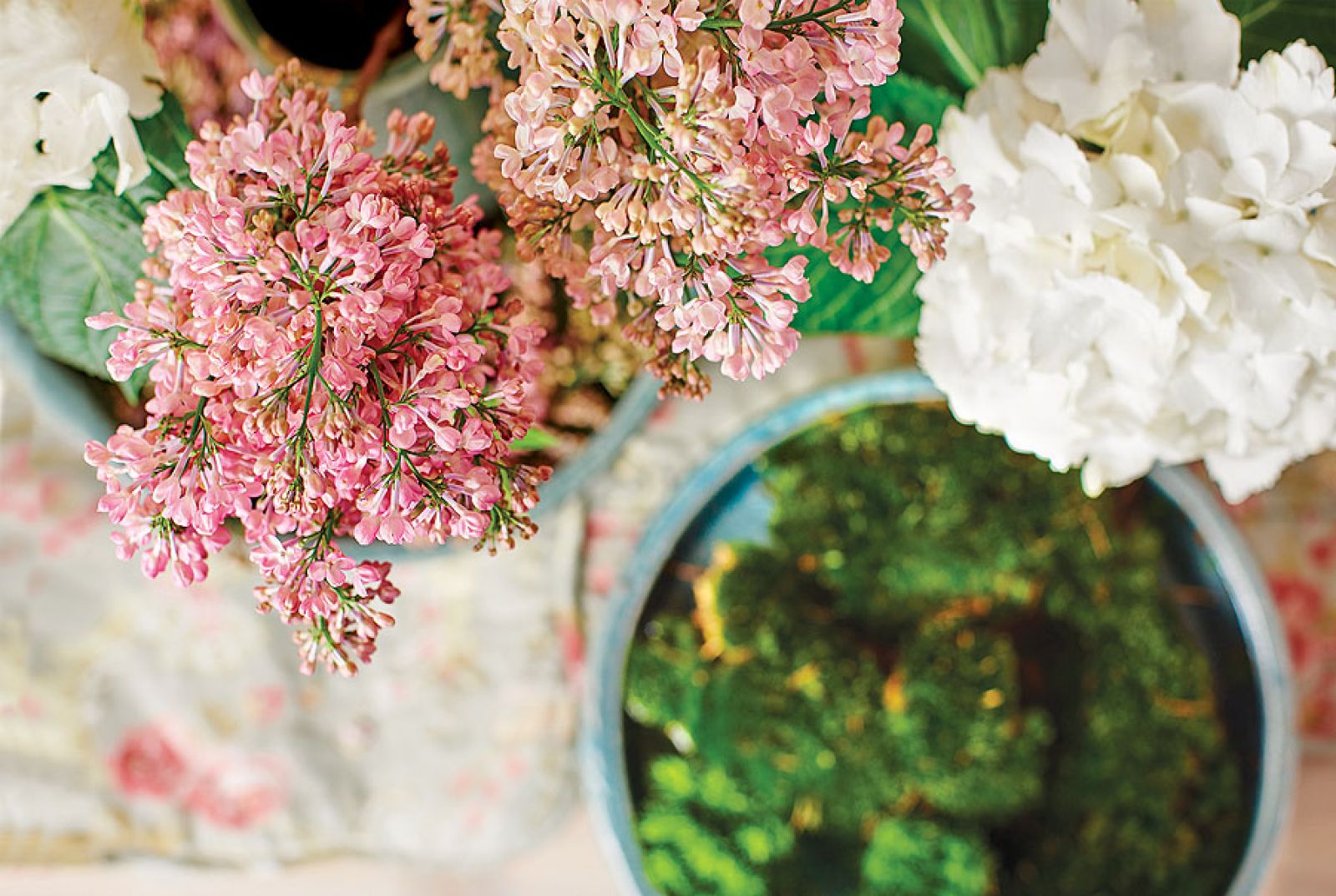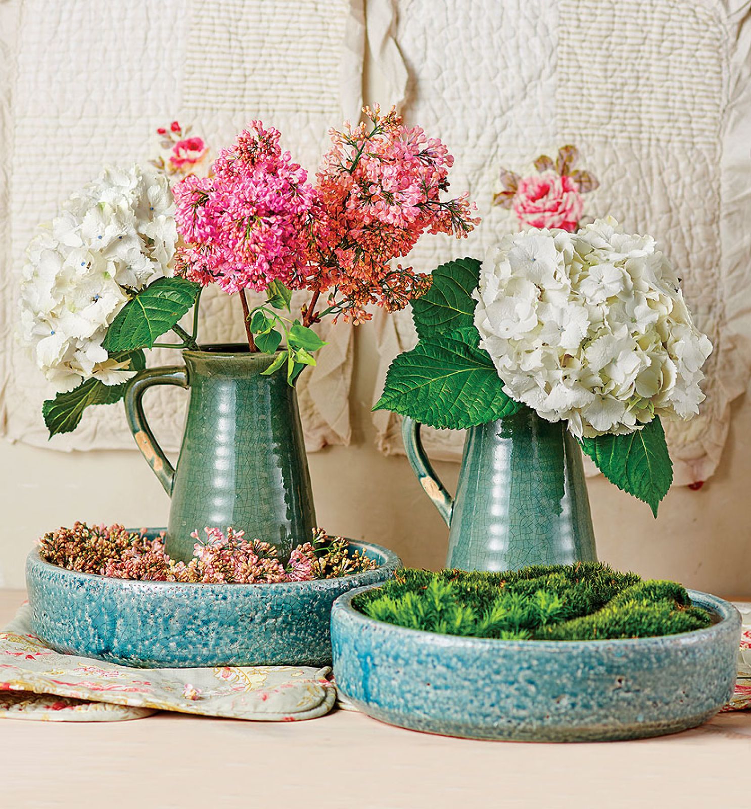 Bez i hortensja. Dwa kwiaty, które łączy prosta, rustykalna ceramika. Obrazek zupełnie sielski, jak słynne „Bzy w wazonie” namalowane przez Édouarda Maneta.
