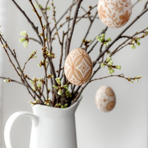 Ozdoby wielkanocne, które można zawiesić, są kwintesencją dekorowania domu. Zimą stroją ciężke gałązki iglaków, wiosną wolą delikatniejsze tło, czyli kwitnące lub suche gałązki eksponowane w wazonie. W tego typu dekoracjach lekkość jest najważniejsza. Jak ją wyczarować? Dekoracje wielkanocne w stylu skandynawskim to oszczędne, momochromatyczne kolory (biel, beż, szarość) kwiatów, pisanek lub ozdób w towarzystwie natury – na przykład gałązek lub wikliny. Kropka.