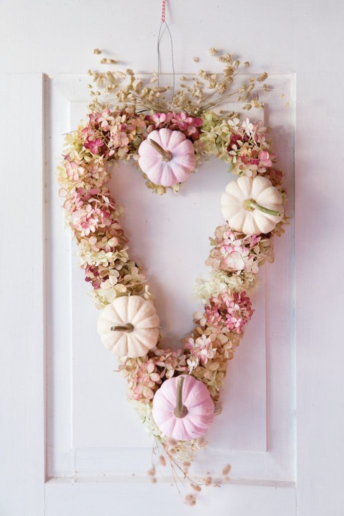 Z dyni, kwiatów hortensji i suszonych traw ozdobnych zrobisz efektowny wianek. Do wykonania jesiennej dekoracji będziesz potrzebowała drucika florystycznego, który jest na tyle miękki, że daje się łatwo uformować, np. w kształt serca. Taki jesienny stroik możesz położyć na stole, komodzie lub powiesić na drzwiach.
