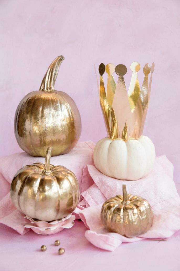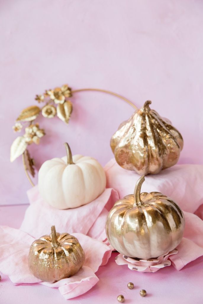 Zanim przystąpisz do dekorowania domu, przygotuj dynie. Część zostaw w naturalnym, kremowobiałym kolorze, inne pomaluj na różowo i złoto. Do malowania wybierz dojrzałe dynie z twardą skorupką, wcześniej je umyj i osusz. Możesz użyć farby-lakieru w sprayu – złotego, błyszczącego z efektem chromu albo różowej farby kredowej lub akrylowej. Po 2-3 tygodniach dynie lekko zmatowieją i wtedy wystarczy nanieść kolejną warstwę farby.