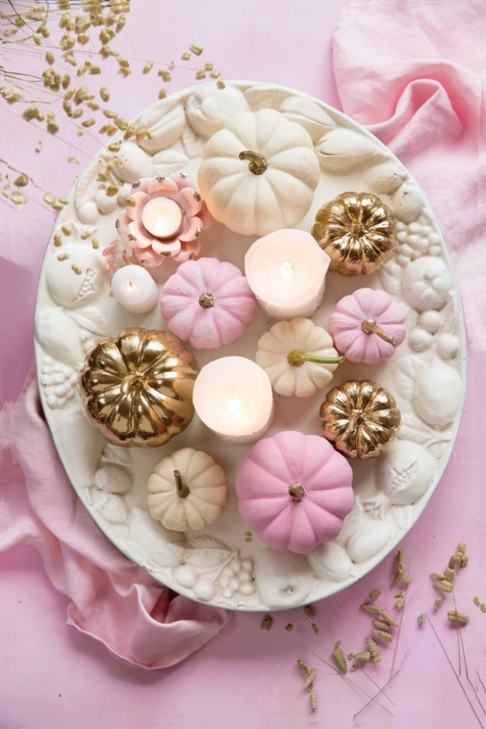 Przygotuj różnej wielkości dynie w trzech kolorach: białe, różowe i złote. Ułóż je na dużym, ozdobnym półmisku albo eleganckiej paterze. Pomiędzy dyniami postaw białe albo złote świece. Taką kompozycję możesz postawić na przykład na środku stołu.