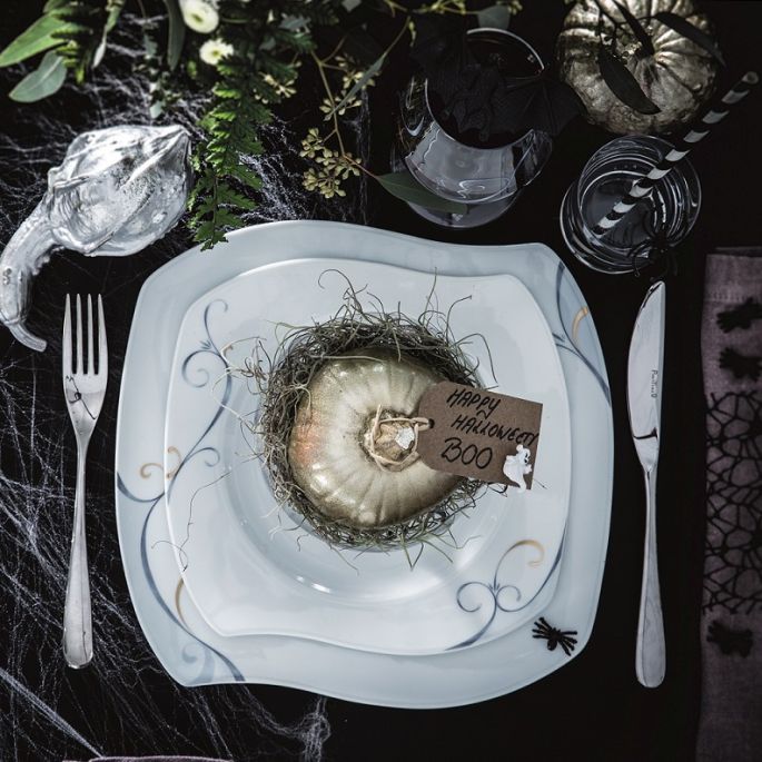 Jak ukdekorować stół na przyjęcie halloweenowe? Wybierz elegancką porcelanę (np. Victoria marki Fyrklövern). Serwis w aranżacji z ciemnym, satynowym obrusem, dyniami w wielu kolorach i kształtach oraz ozdobami z czarnego papieru przedstawiającymi nietoperze i pająki, stworzy nastrój odpowiedni na tę noc. Zastawa zawiera szeroki wybór talerzy, salaterek, szklanek i innych dodatków, co pozwala na przygotowanie niepowtarzalnego nakrycia stołu.
