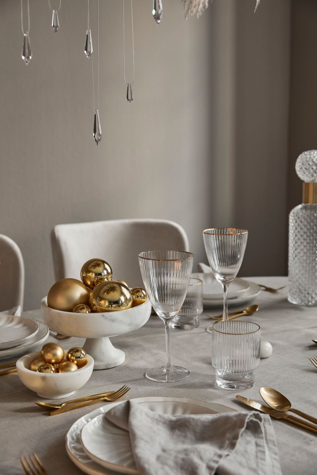 Do dekoracji stołu wigilijnego w stylu glamour wybierz perłowe szarości, śnieżną biel, złoto oraz elegancką czerń. Ozdabiaj stół świecami w kryształowych latarenkach, lśniącymi miseczkami pełnymi połyskujących szklanych bombek, światełkami choinkowymi. Nie zapomnij o eleganckim wianku bożonarodzeniowym przystrojonym jemiołą. W aranżacji świątecznego stołu w stylu glamour wszystko musi błyszczeć, nie tylko wypolerowane sztućce. Dlatego wybierz złote talerze i filiżanki, podkładki ze złotą nitką oraz kryształowe szklanki i kieliszki. Dekoracje mogą być bogato zdobione, trzeba je tylko zestawiać z odpowiednim umiarem.