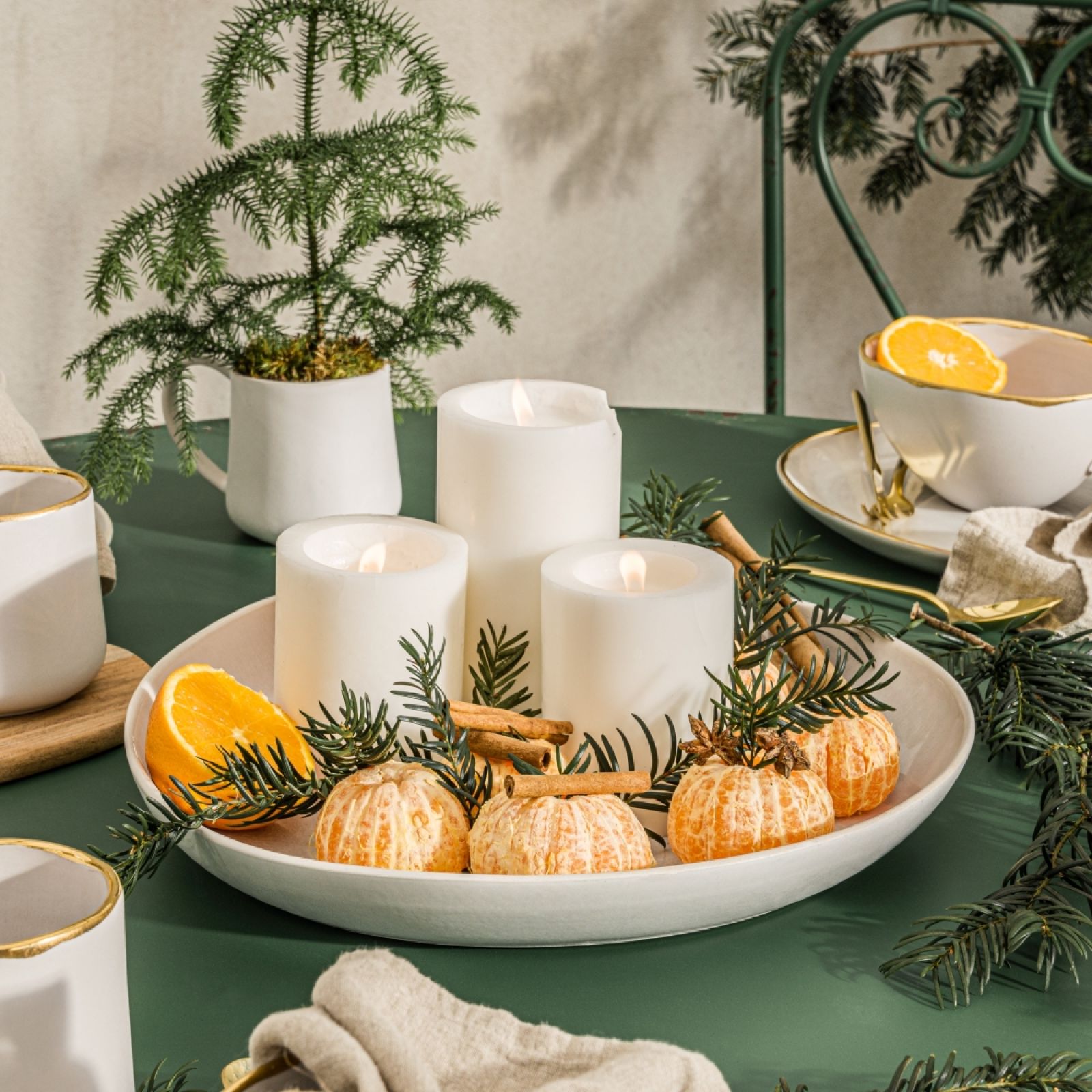 Świąteczny stół w skandynawskim stylu ozdobią dekoracje z naturalnych materiałów – szyszek, gałązek, suszonych owoców, drewna oraz papieru. Jeśli chcesz dodać blasku bożonarodzeniowej aranżacji poprzeplataj naturalne ozdoby brokatowymi bombkami albo szklanymi świecznikami w różnych kolorach. Ciepłe światło świec sprawi, że w domu zrobi się bardzo nastrojowo. Na świątecznym stole w stylu skandynawskim obrus nie jest obowiązkowy – talerze możesz postawić na blacie lub na lnianych serwetkach. Mile widziane są za to: ręcznie robiona ceramika, papierowe gwiazdy betlejemskie, świece z naturalnego wosku i wieniec ze świeżych gałązek oraz szyszek.