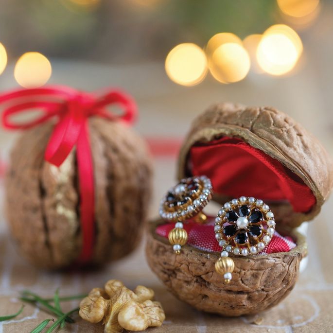 Łupiny włoskich orzechów też mogą się przydać do zapakowania świątecznych prezentów. Pierścionki, kolczyki, wisiorki można ukryć w tych malutkich ekopuzderkach. W środku wyściełanych kawałkiem materiału, z zewnątrz przewiązanych wstążeczkami albo oklejonych kawałkami gazet.
