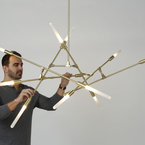 Zobaczymy też serię Halo – aluminiowe pierścienie przewleczone przez klocek ze szczotkowanego mosiądzu tworzą modułowy system lamp, które w zależności od upodobań możemy łączyć, tworząc żyrandole z kilku, a nawet kilkunastu świecących elementów.