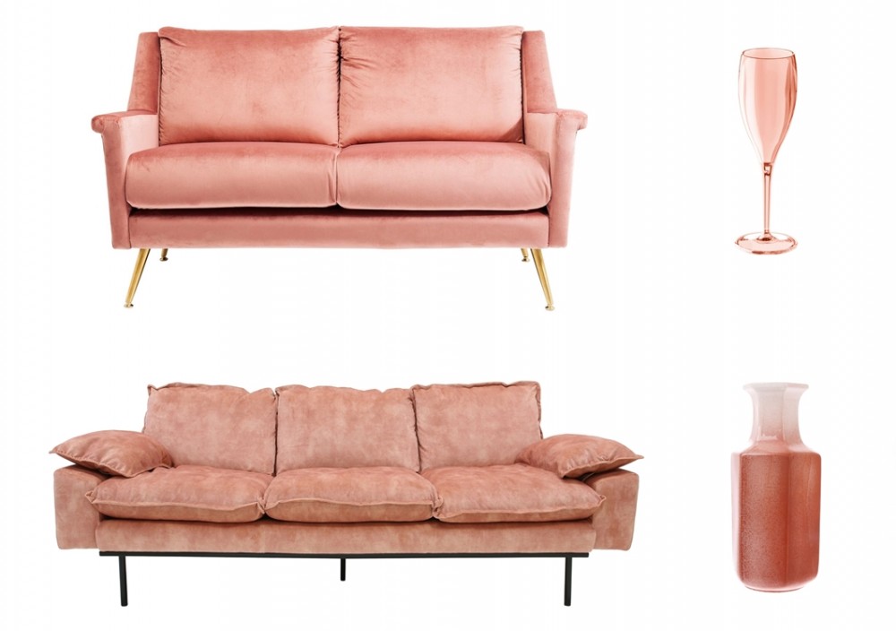 Od lewej sofa z aksamitu i kieliszek do szampana, WestwingNow.pl, kanapa i wazon HK Living, Dutchhouse.pl