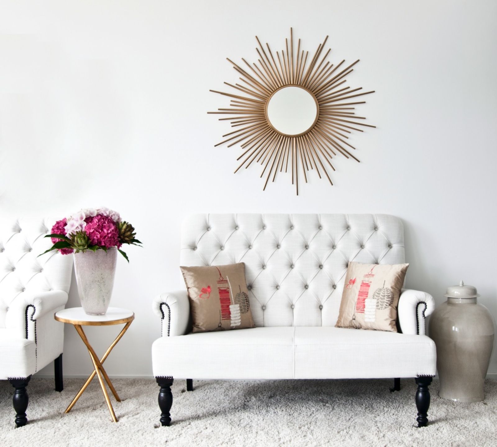 Lustro w salonie będzie przede wszystkim pełniło funkcję dekoracji – w tym przypadku sprawdzą się lustra w modnym kształcie słońca, w stylu glamour albo kilka modeli połączonych ze sobą niczym plaster miodu.