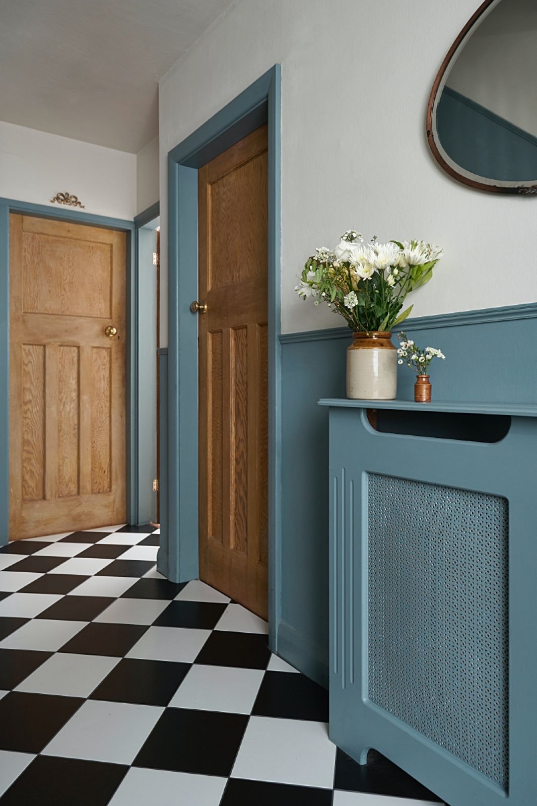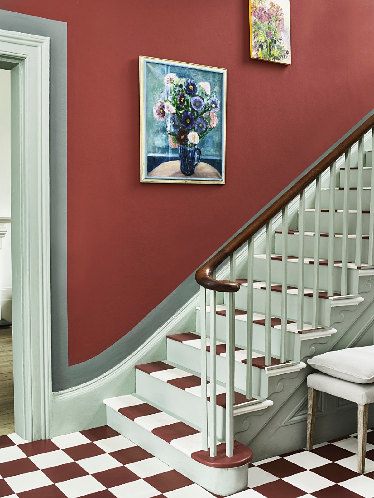 Prawdziwy charakter wnętrza budują detale, dlatego warto zwrócić uwagę na drobne elementy, które zazwyczaj pomijamy. Pomaluj czoło lub górę stopni schodów, listwy przypodłogowe, futryny, okienne opaski. Zrób tło dla klamek czy uchwytów, np. w formie półkola. To niby drobiazg, a robi ogromną różnicę w odbiorze całego przedpokoju.