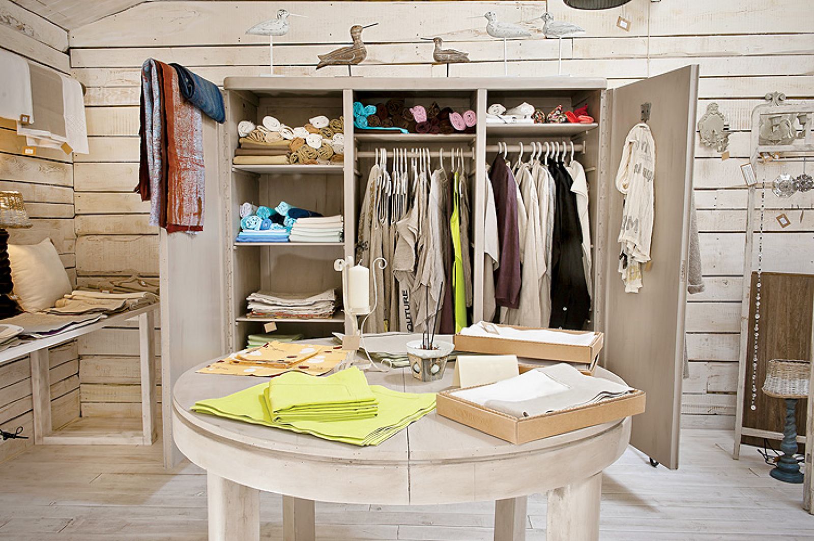 Lniany Zaułek proponuje też fanom tkaniny dodatki, które do niej idealnie pasują. Zrobione z porcelitu wazony, zastawę stołową, drewniane figurki ptaków, wiklinowe kosze i piękne lustra.