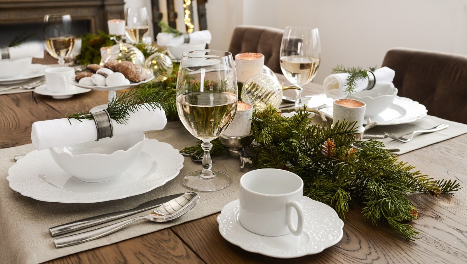 Nakrycie stołu na Boże Narodzenie zaczynamy od doboru obrusa. W święta najlepiej sprawdzi się ten klasyczny – biały. Będzie on świetną bazą do stworzenia zarówno klasycznej aranżacji, jak i tej w stylu glamour czy nowoczesnym. Warto zainwestować w dobrej jakości obrus plamoodporny, który posłuży przez dłuższy czas. Jeżeli posiadamy piękny, drewniany stół, nie musimy go przykrywać i chować. W takiej sytuacji wystarczy bieżnik ułożony wzdłuż stołu lub kilka bieżników, które można rozłożyć na szerokość stołu.