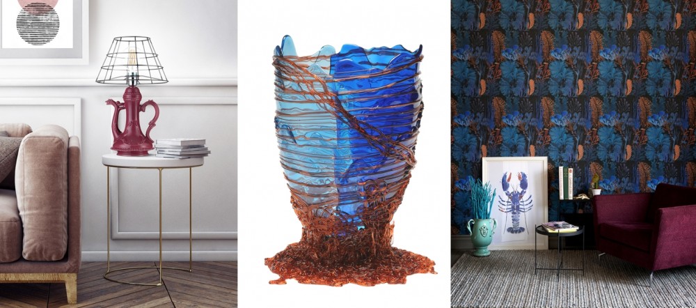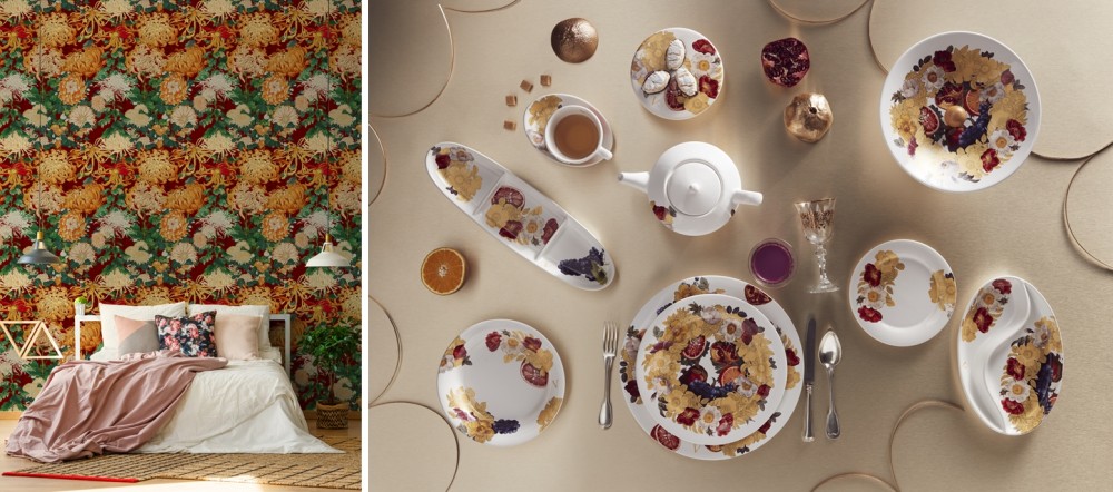 zdjęcia: tapeta Chrysanthemums, Mind the Gap, ceramika Ghirlanda, Ceramiche Viva, Lampa, Rebirth wazon, Corsi Design, tapeta Coral reef, Mind the Gap