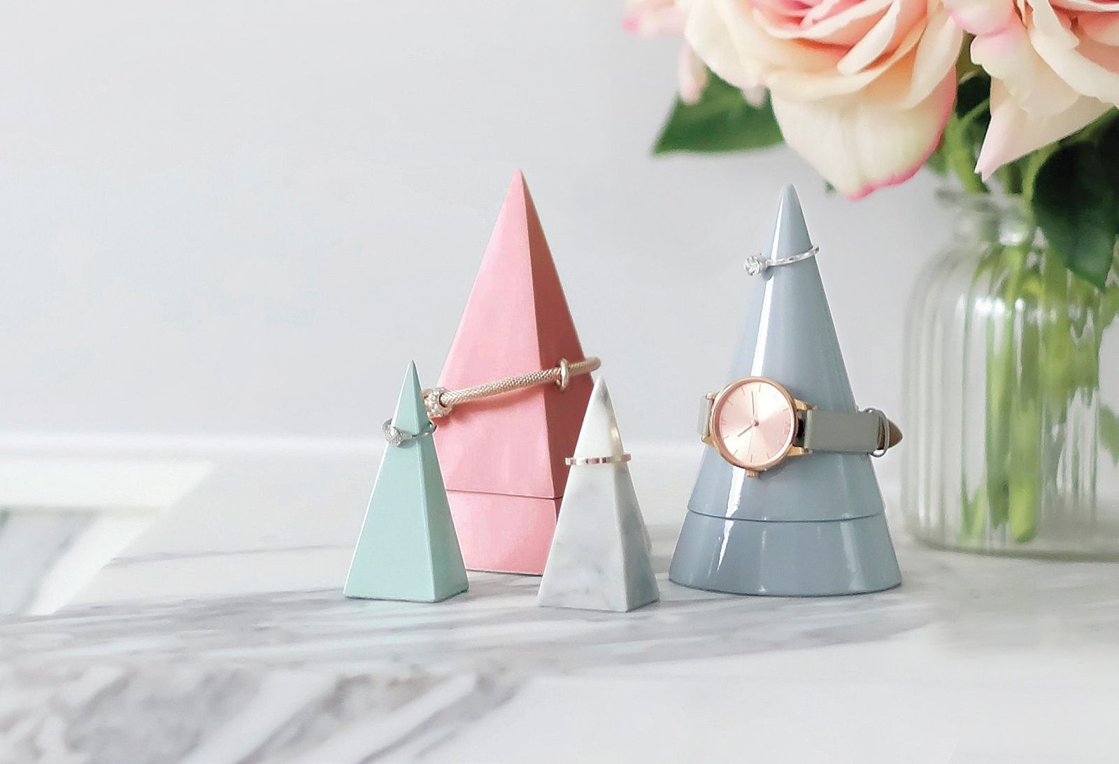 Pierścionki, bransoletki i zegarki wsuń na kolorowe stożki: pastelowe, które przypominają odwrócony rożek lodowy, minimalistyczne betonowe lub bardzo modne imitujące marmur lub terazzo. Stojak na biżuterię o prostym, geometrycznym kształtcie sprawdzi się niemal w każdym wnętrzu. Postaw kilka obok siebie, połącz różne faktury lub kolory, a stworzysz oryginalną kompozycję.