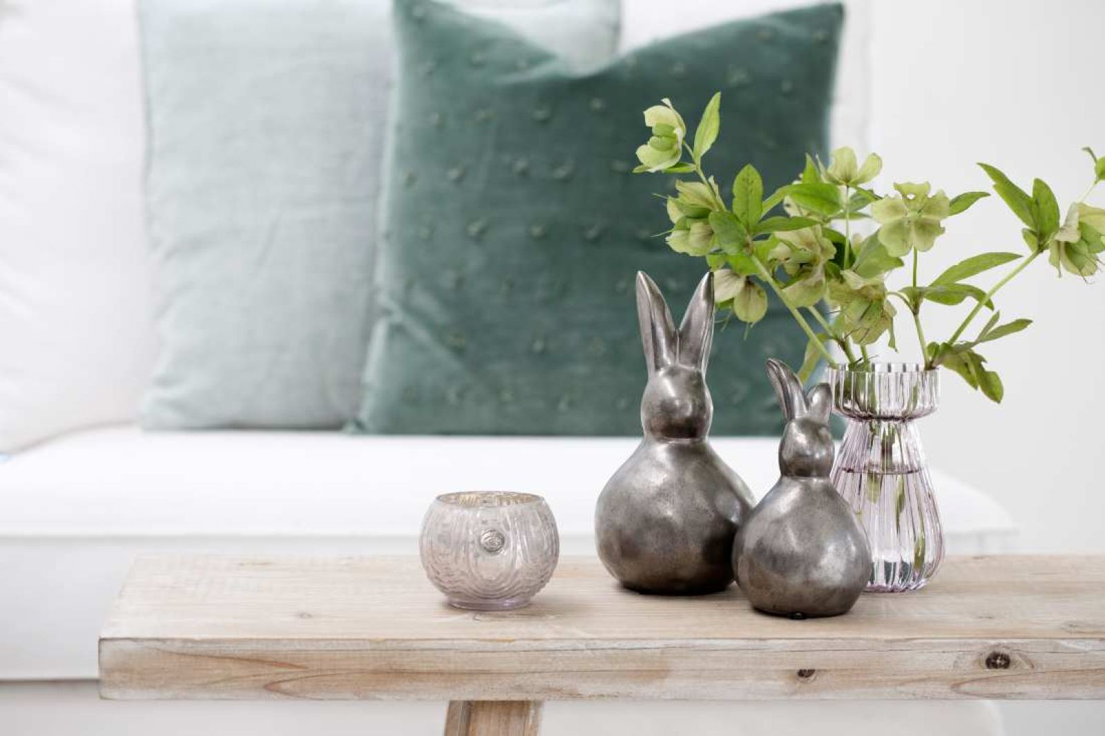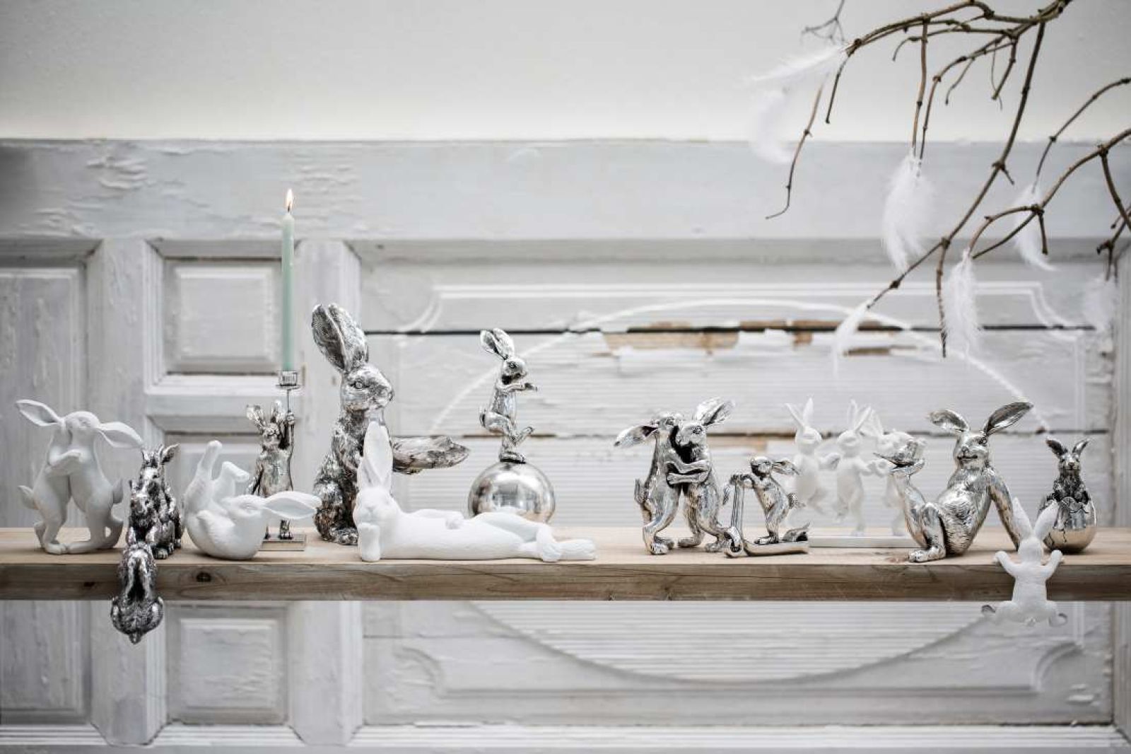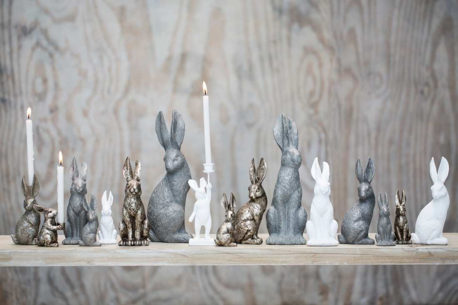 Większe figurki (te tradycyjne – ceramiczne i porcelanowe, ale i te bardziej nowoczesne – oszczędne w formie, w metalicznym wykończeniu) umieszczone pośrodku wielkanocnego stołu będą punktem skupiającym wzrok. Natomiast stadko – zajączków identycznych lub z tej samej serii – rozstawionych na długości stołu dodzadzą dekoracjom harmonii i rytmu. Figurki można ustawić w prostej linii, symetrycznie albo z nonszalanckim luzem.