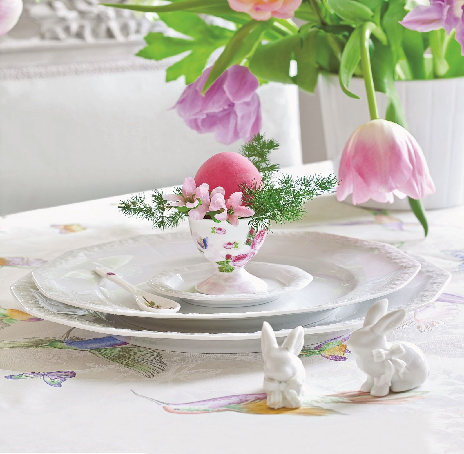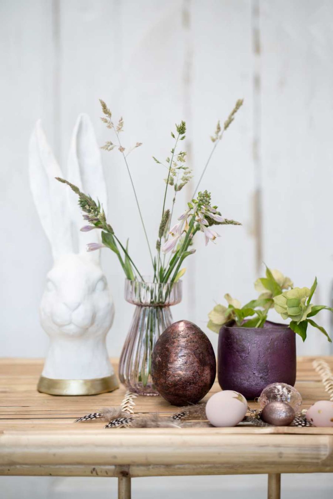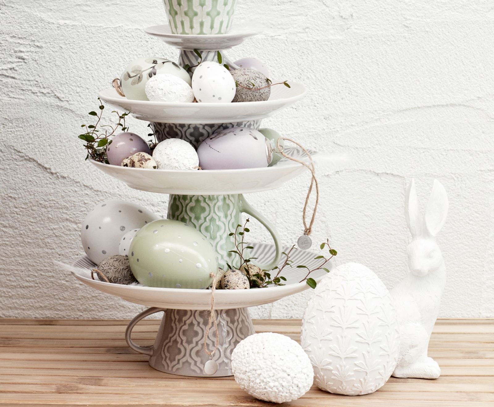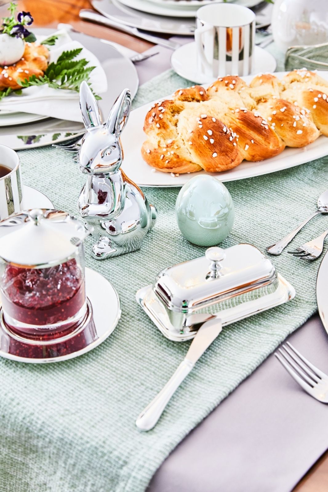 Większe figurki (te tradycyjne – ceramiczne i porcelanowe, ale i te bardziej nowoczesne – oszczędne w formie, w metalicznym wykończeniu) umieszczone pośrodku wielkanocnego stołu będą punktem skupiającym wzrok. Natomiast stadko – zajączków identycznych lub z tej samej serii – rozstawionych na długości stołu dodzadzą dekoracjom harmonii i rytmu. Figurki można ustawić w prostej linii, symetrycznie albo z nonszalanckim luzem.