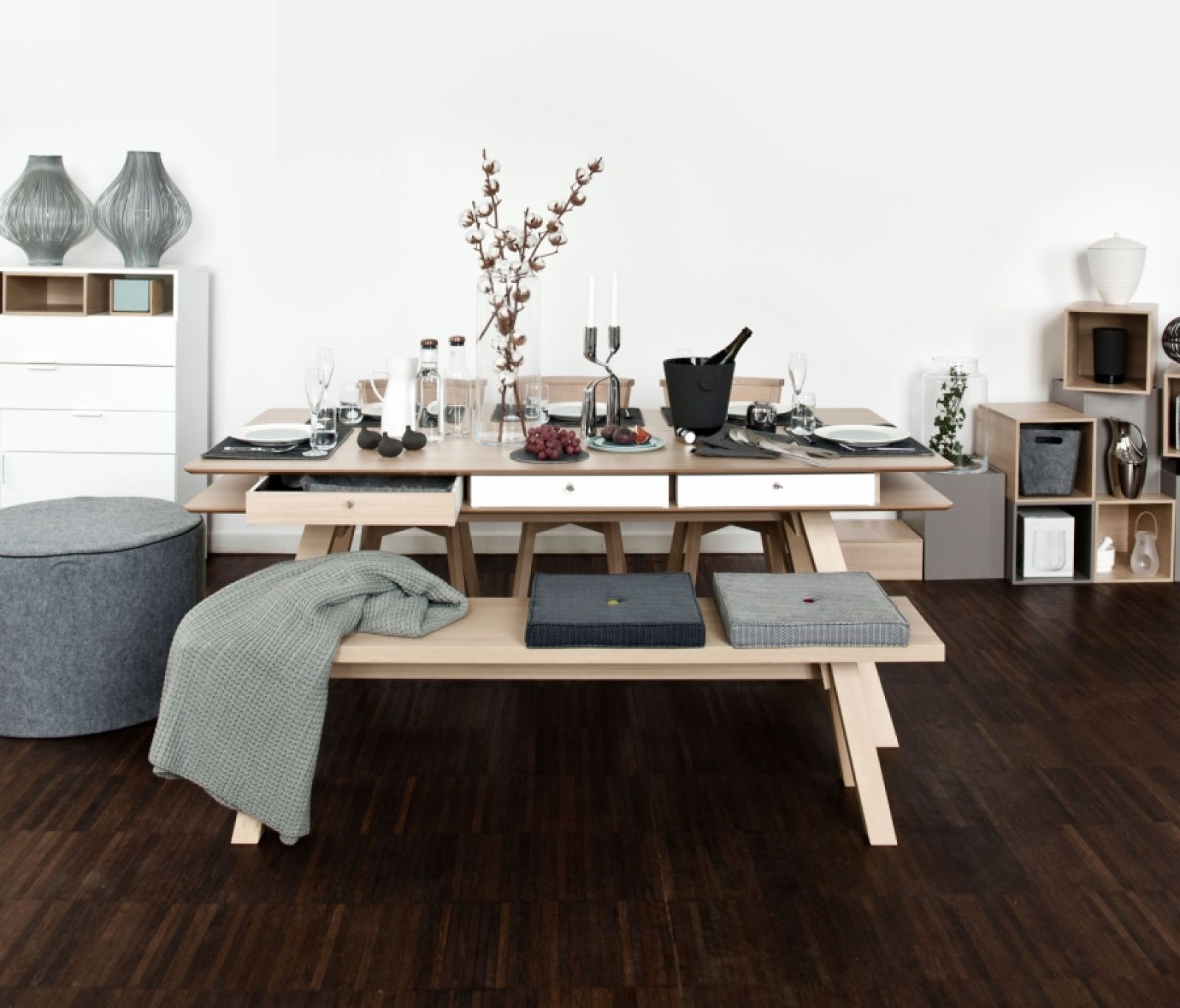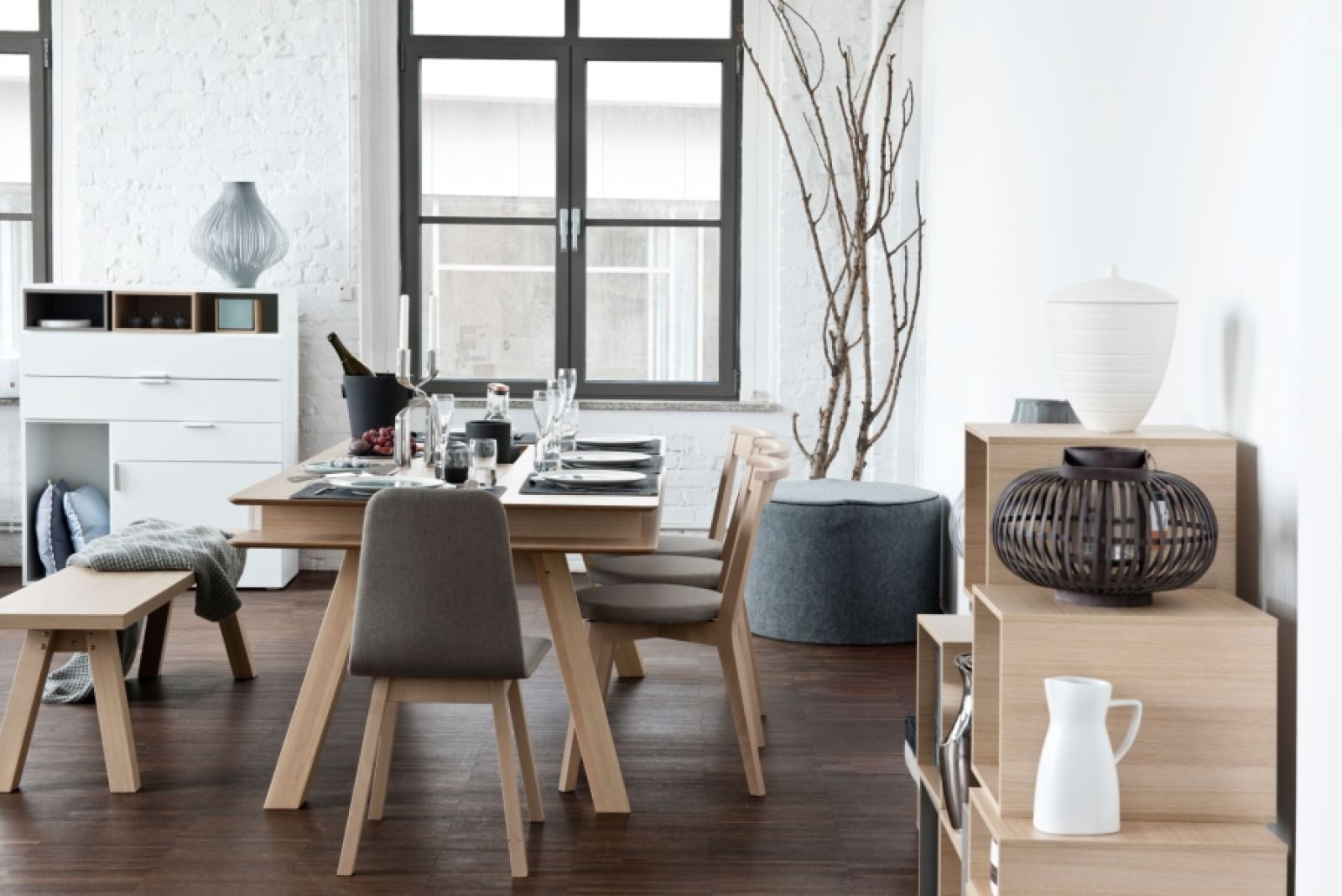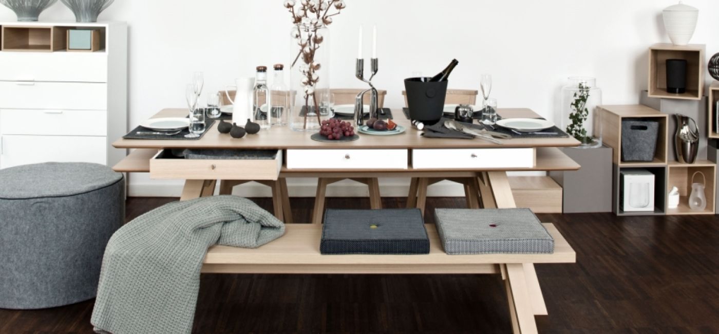 Spójrzcie tylko, jak stół z kolekcji 4 You zaaranżowała firma VOX. Niby nic spektakularnego, a jednak aż chce się przy nim usiąść. Właściwie grzechem byłoby zastawiać go czymś więcej. To właśnie dębowe drewno ociepla szare i proste dodatki, a filcowe podkładki położone pod porcelanową zastawą nabierają szlachetnego i eleganckiego charakteru.