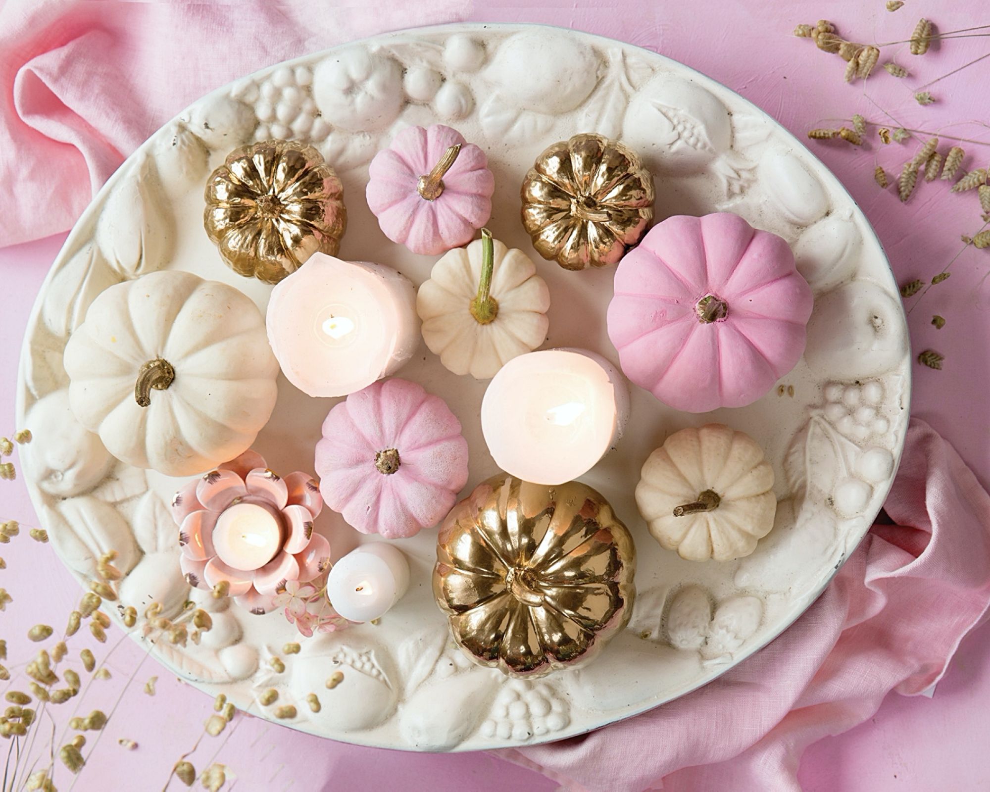 Jak zrobić nastrojowe ozdoby do domu – 10 prostych pomysłów na różowo-złote dekoracje i stroiki z białych dyń