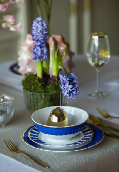 Na świątecznym stole błękity i kobalty pięknie połączysz z bielą, ciepłymi beżami, wszelkimi odcieniami zieleni, żółcieni oraz złotem. Ciekawy, nieograny miks w dekoracjach wielkanocnych stanowią granat i róż – to klasyka z nutą kobiecości. Niech podstawą aranżacji świątecznego stołu będzie mocny akcent w postaci kobaltowej ceramiki – tradycyjnej kamionkowej albo tej wywodzącej się̨ z królewskich manufaktur. W wersji nieco bardziej swojskiej możesz wybrać na przykład naczynia z rodzimego Bolesławca. Obok ceramiki ustawiaj kryształowe szkło. Do tego serwety w odcieniach bieli lub pudrowego różu, hiacynty w szklanej, przezroczystej miseczce zamiast doniczki i zielone gałązki w wazonach.