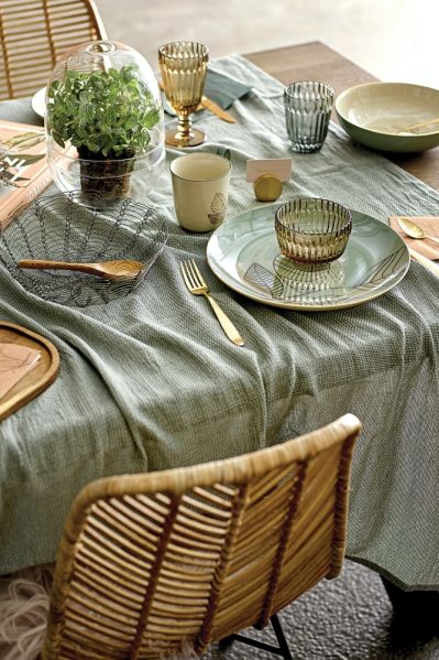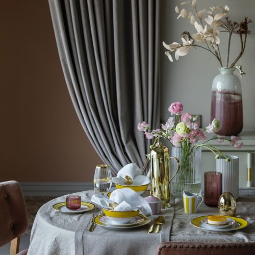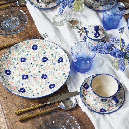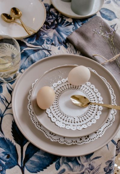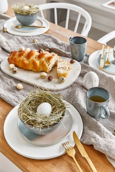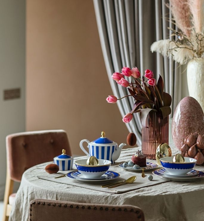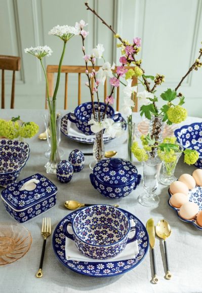 Kobaltowe czy granatowe wzory na obrusach dodadzą wyrazistości wielkanocnym aranżacjom. Dzięki nim eleganckie stoły uginające się̨ pod pasztetami i babami wyglądają̨ lekko, jasno i przyjemnie. Na takim tle pięknie prezentują się świeże kwiaty.