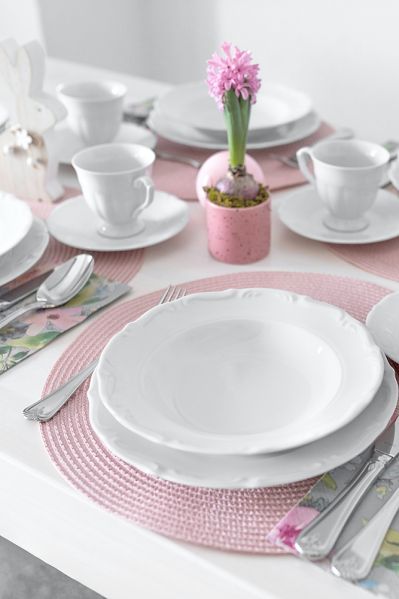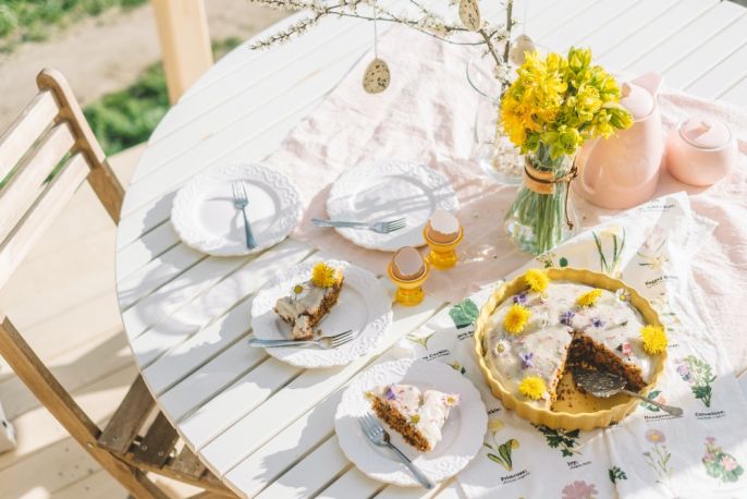 Pomysłowe dekoracje to kwiaty cebulowe w kolorowej wazie oraz serwetki ozdobione gałązkami puchatych bazi lub żółtych forsycji. Bukszpan ułóż w filiżankach albo koszyczku i połóż na nim pisanki. Świątecznym jajom towarzystwa dotrzymają tradycyjne wielkanocne zajączki, kurczaczki oraz cukrowe baranki. Do wiosennej aranżacji stołu pasują zarówno klasyczne białe dodatki, jak i modne naturalne dekoracje, na przykład drewniane misy czy rattanowe podkładki pod talerze.