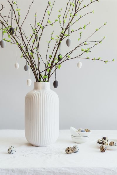 Wybieraj białe dodatki: patery, świeczniki i figurki zajączków. Mieszaj wzory i materiały, obok porcelany ustawiaj kryształowe szkło. Do wazonów obowiązkowo wstaw piękne bukiety, a do szklanej bomboniery pyszne słodkości.