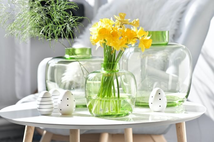 Rozłóż pojedyncze kwiatowe główki między talerzami, wstaw je do kieliszków – niech każdy z gości ma swój minibukiecik przy nakryciu – albo ułóż na nich jajka w salaterce. Inne ciekawe pomysły na dekoracje świątecznego stołu znajdziesz w artykule: Stół wielkanocny – jak udekorować stół na świąteczne śniadanie?
