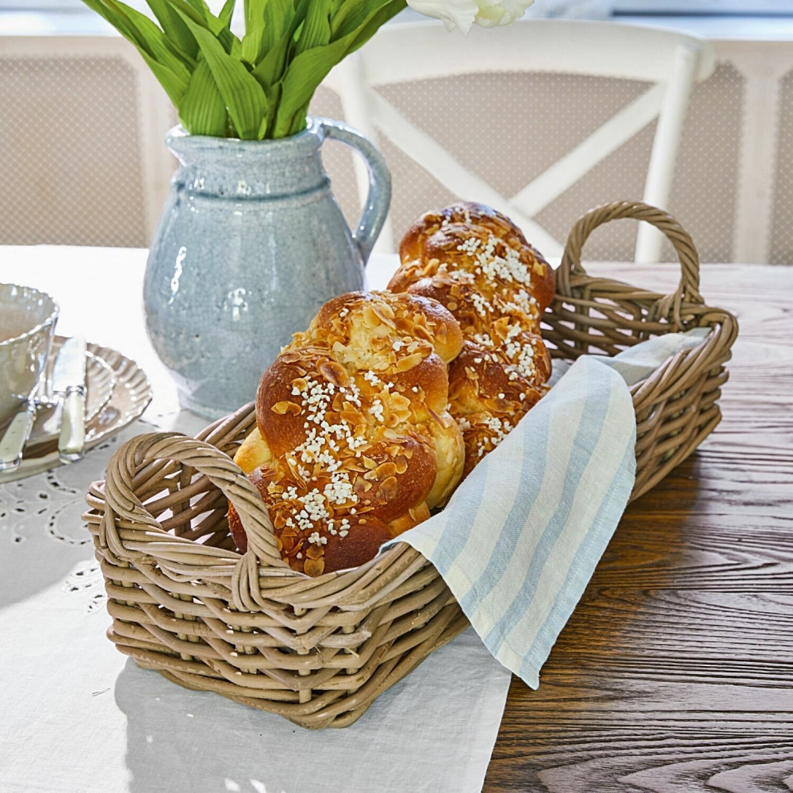 Babeczki możesz ułożyć także na dekoracyjnym talerzu lub ozdobnej tacy, a kruche ciastka i makaroniki włożyć do szklanych lub ceramicznych miseczek. Drożdżówki lub chałki ładnie zaprezentują się w plecionych koszyczkach.