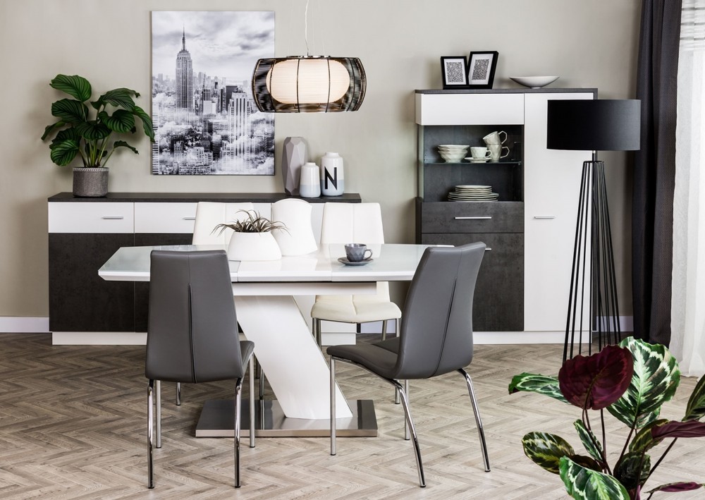 Jeśli szukasz uzupełnienia nowoczesnej jadalni, idealnym wyborem okaże się stół wykonany w dwóch najpopularniejszych kolorach, czyli czerni i bieli, które świetnie wpisują się w stylistykę tego typu wnętrz. Oprócz odpowiedniej kolorystyki, warto zadbać także o designerski wygląd, by mebel pasował do przestrzeni nowoczesnej jadalni. Wspomniany wcześniej sprawdzony duet czerni i bieli można więc nieco urozmaicić za pomocą geometrycznych form. Kto powiedział, że stół musi mieć cztery nogi? A gdyby wybrać mebel do jadalni na postumencie lub na podstawie w formie krzyżaka? Takie nietypowe kształty wprowadzą do wnętrza oryginalny styl.