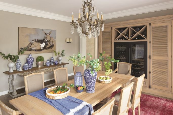 5. Jadalnia w stylu prowansalskim z kryształowym żyrandolem nad stołem