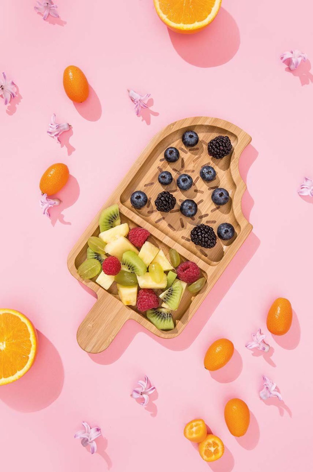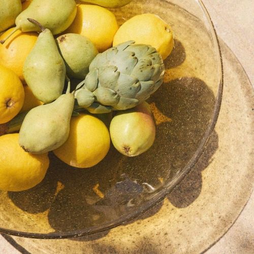 Wysoka podstawa mis do serwowania jeszcze lepiej wyeksponuje zawartość i zachęci biesiadników do sięgania po owoce. Te mniejsze z kolei, np. aromatyczne kumkwaty czy pomidorki koktajlowe, podaj w podłużnym półmisku przypominającym strąk fasoli.