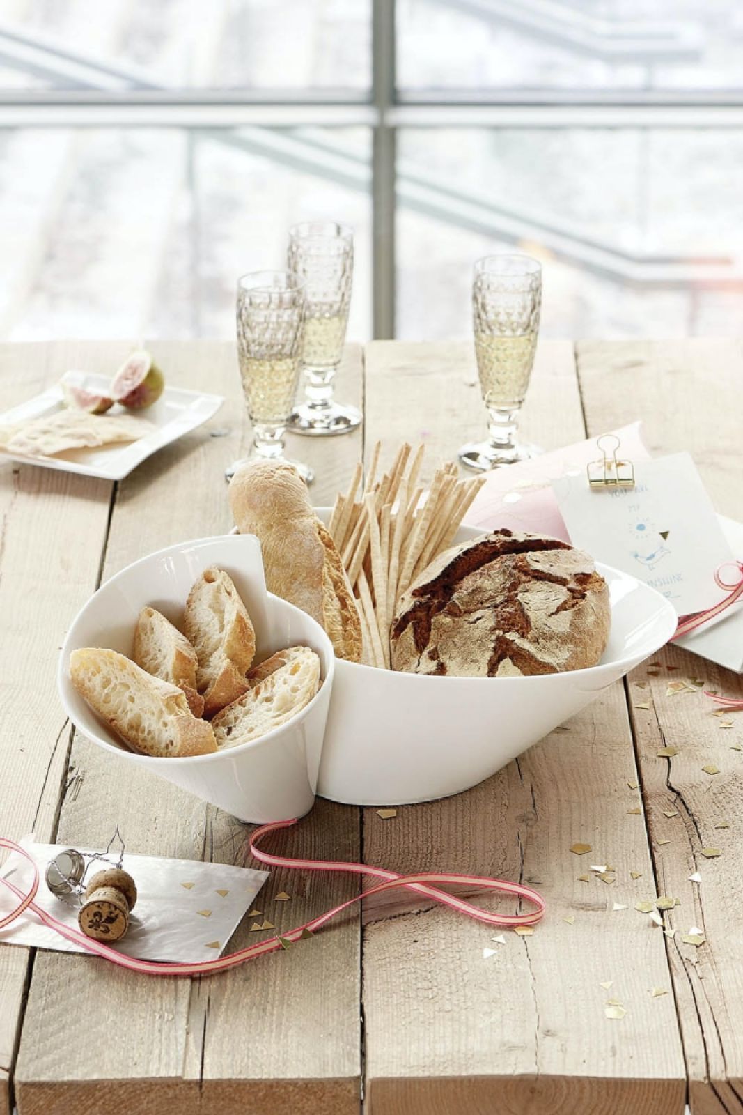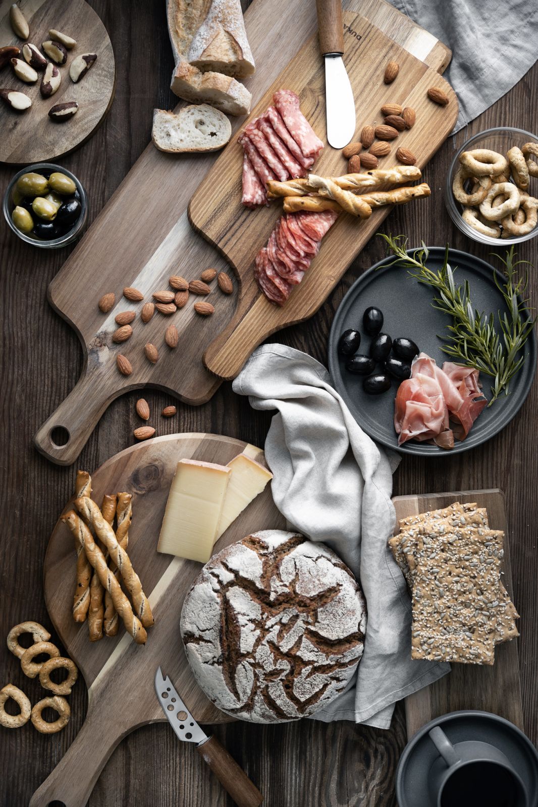 Przystawki, takie jak pieczywo, sery, wędliny serwuj na desce – drewno i kamień na stole