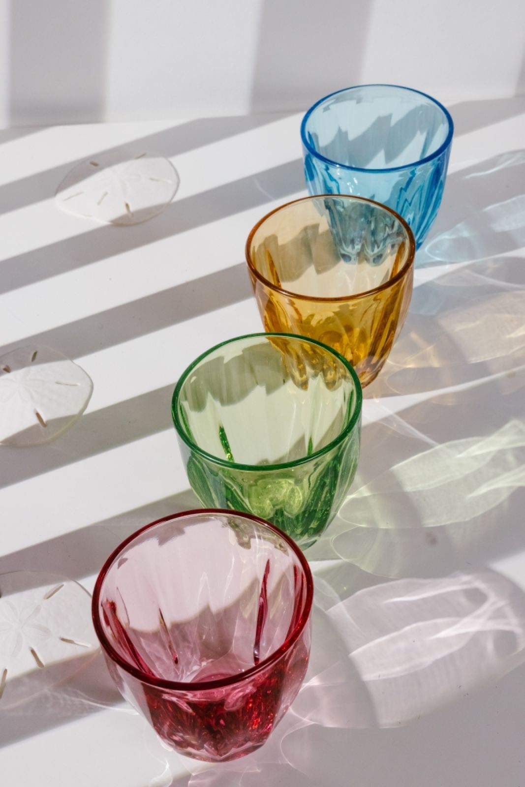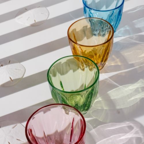 Letnie koktajle z owocami, miętą i dużą ilością lodu najlepiej podawać w czarkach na wysokiej, smukłej nóżce czy w tzw. szampanówkach. Szkło może być kolorowe, ale koniecznie przejrzyste, by móc podglądać jak pięknie bąbelki musują i mienią się w słońcu. Kieliszek o szerokiej czaszy pozwoli dodatkowo delektować się zapachem i spróbować zatopionych w nim owoców.