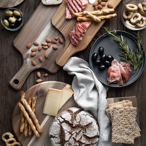 Poukładaj na nich to co lubisz – pachnące prosciutto, obok sery, oliwki, koktajlowe pomidorki, winogrona. Układaj produkty warstwami, twórz kontrasty. Do tego sztućce – różne do serów i do wędlin. Taki smakowity miks będzie pięknie wyglądał na stole i kusił, by wszystkiego spróbować.