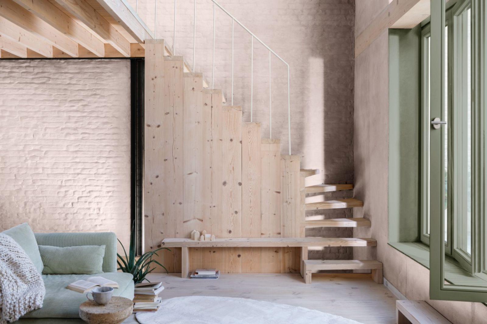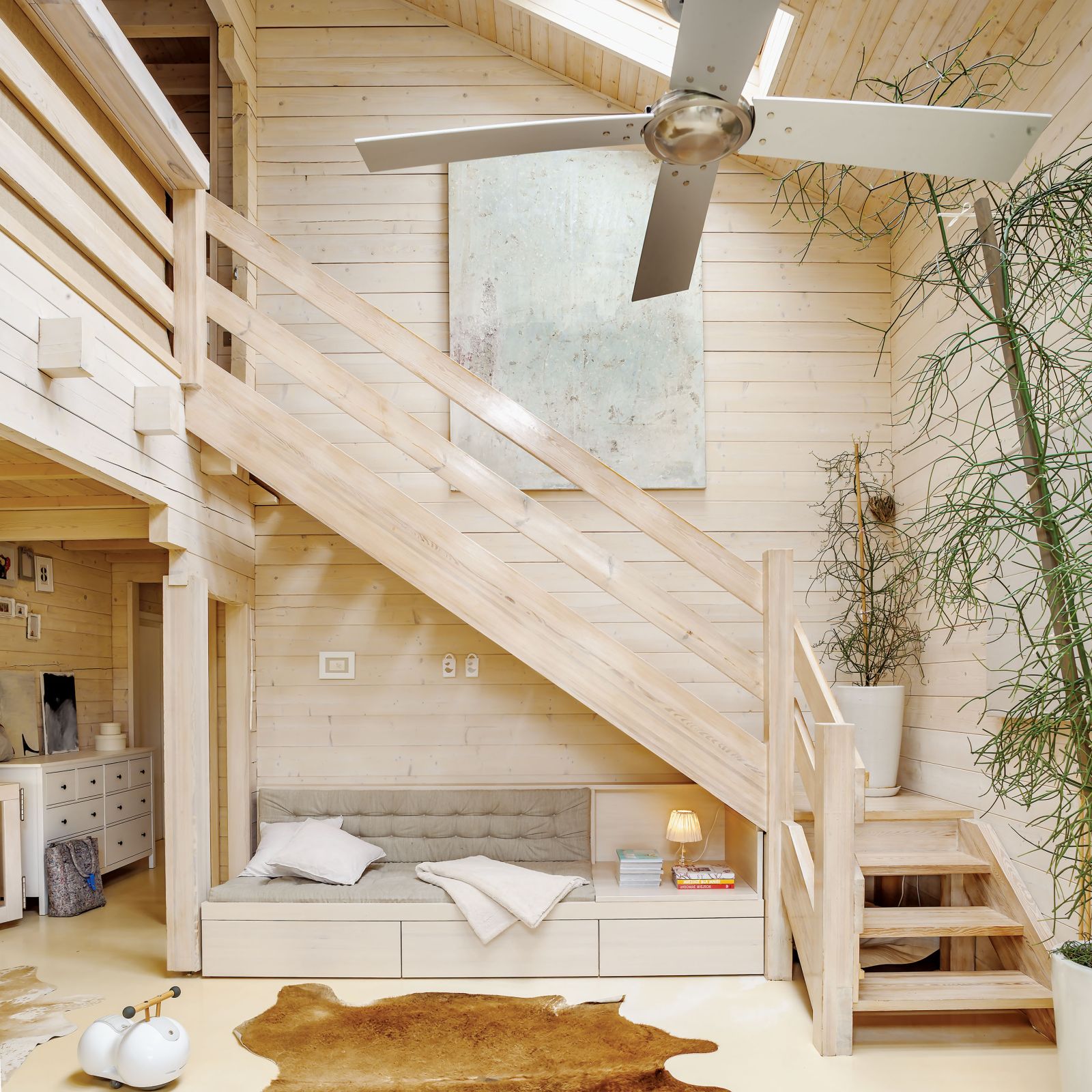 Kiedy pod ażurowymi schodami typu drabina biegną lite, masywne, warto wykorzystać je na ustawienie pamiątkowych rzeczy, książek, dekoracji sezonowych, ozdobnych wazonów... Albo po prostu narzucić na nie poduchy i stworzyć dodatkowe siedziska. Szerokie, drewniane stopnie są ciepłe i satynowo gładkie – zachęcają by na nich przysiąść.