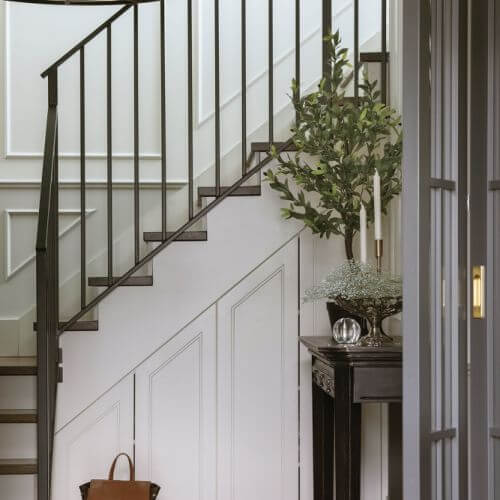 Jeśli schody są blisko wejścia, zaaranżuj pod nimi miejsce z wieszakami na kurtki i płaszcze, otwartymi półkami lub szafką na buty. Obok postaw ławeczkę lub puf – będzie przydatny przy wkładaniu butów, a jeśli ma schowek możesz w nim ukryć szczotki, pasty, łyżki do butów. Płaszcze wiszące na widoku nigdy nie wyglądają dobrze, tym bardziej wałęsające się buty, a pod schodami będą niewidoczne.